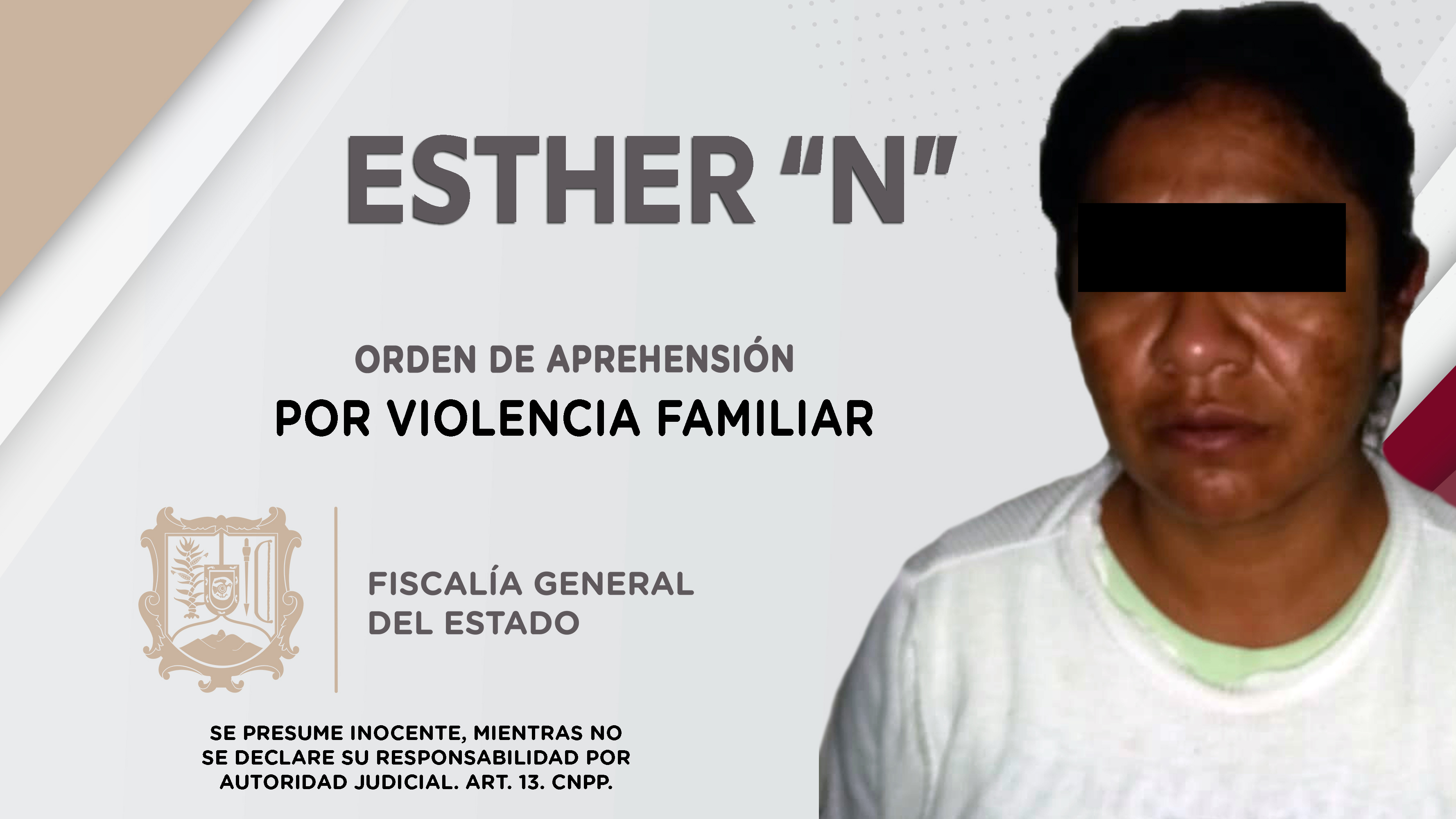 Elementos de la Agencia de Investigación Criminal cumplimentaron una orden de aprehensión en la capital nayarita, la cual se ejecutó contra Esther “N”, por su presuntiva responsabilidad penal en hechos que la ley señala como delito de violencia f...