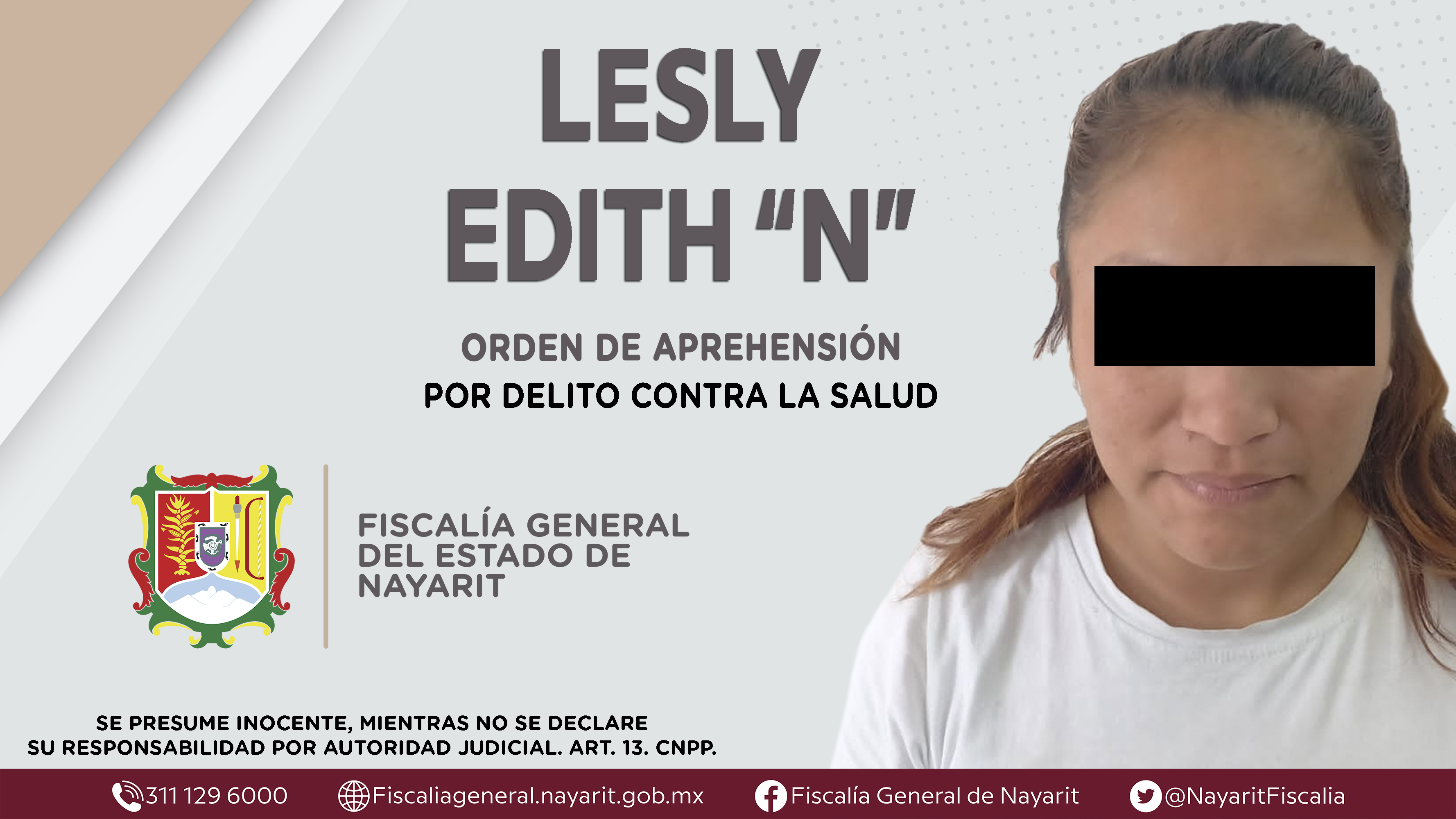 Fiscalía General del Estado a través de la Agencia de Investigación Criminal ejecutó una orden de aprehensión en la capital nayarita contra Lesly Edith “N”, por su presunta participación en hechos que bajo apreciación de la ley configuran el d...