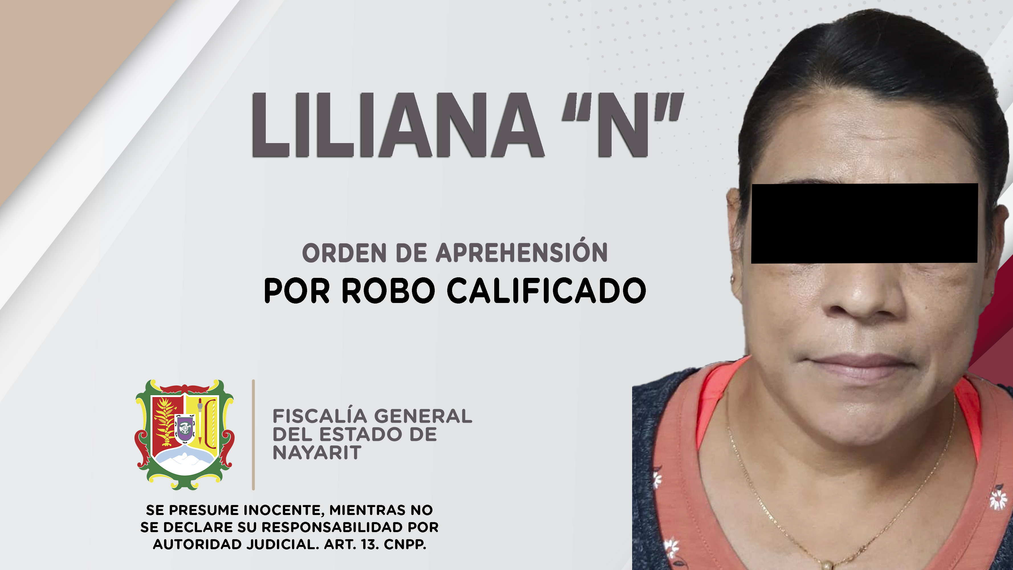 Elementos de la Agencia de Investigación Criminal ejecutaron una orden de aprehensión contra Liliana “N”, por su probable responsabilidad penal en hechos que la ley señala como delito de robo calificado, cometido en perjuicio de una persona de sex...