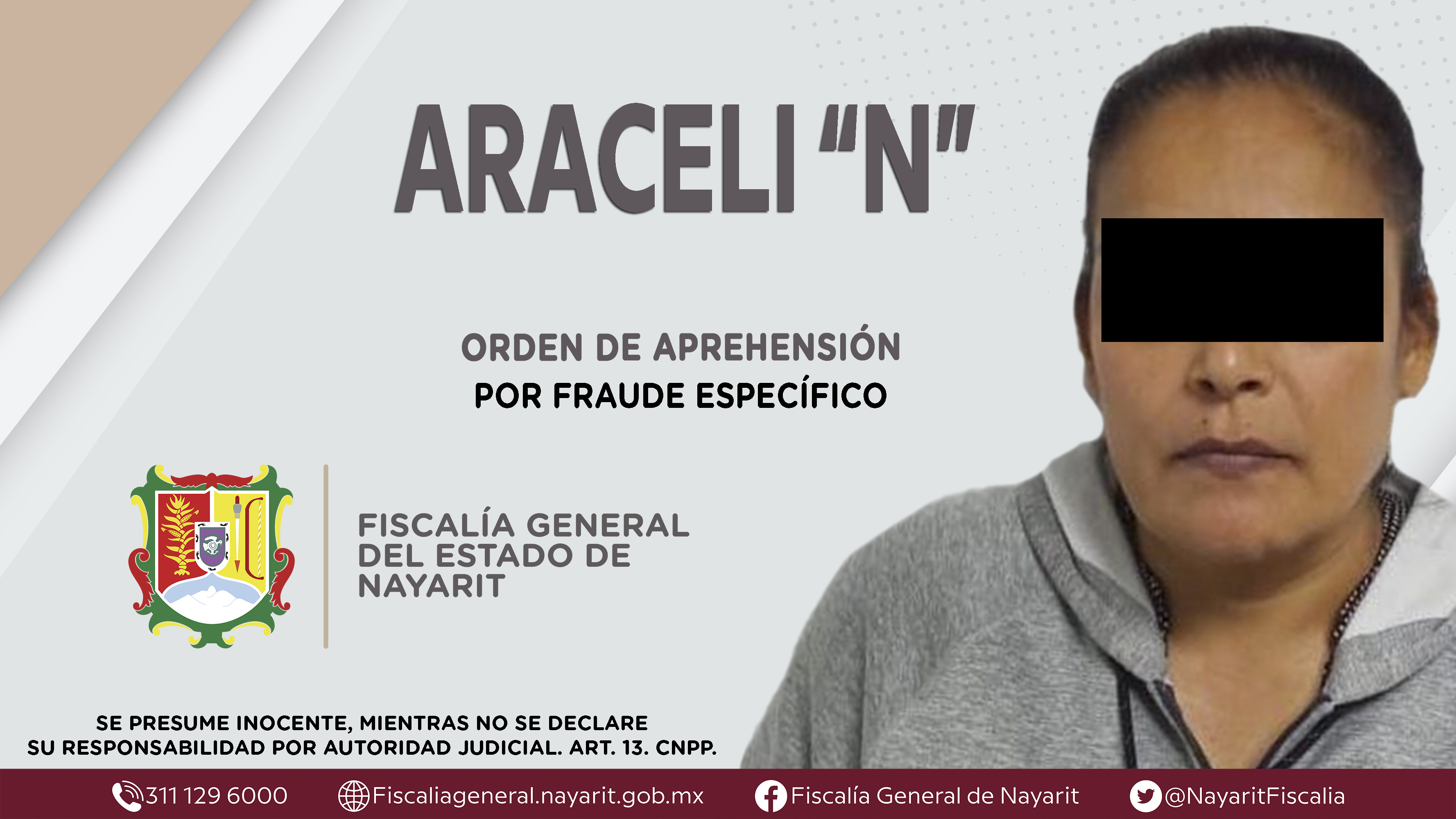 Con la colaboración de la Fiscalía General del estado de Jalisco, elementos de la Agencia de Investigación Criminal de Nayarit ejecutaron una orden de aprehensión en la ciudad de Puerto Vallarta, Jalisco contra Araceli “N”, por su presunta partic...
