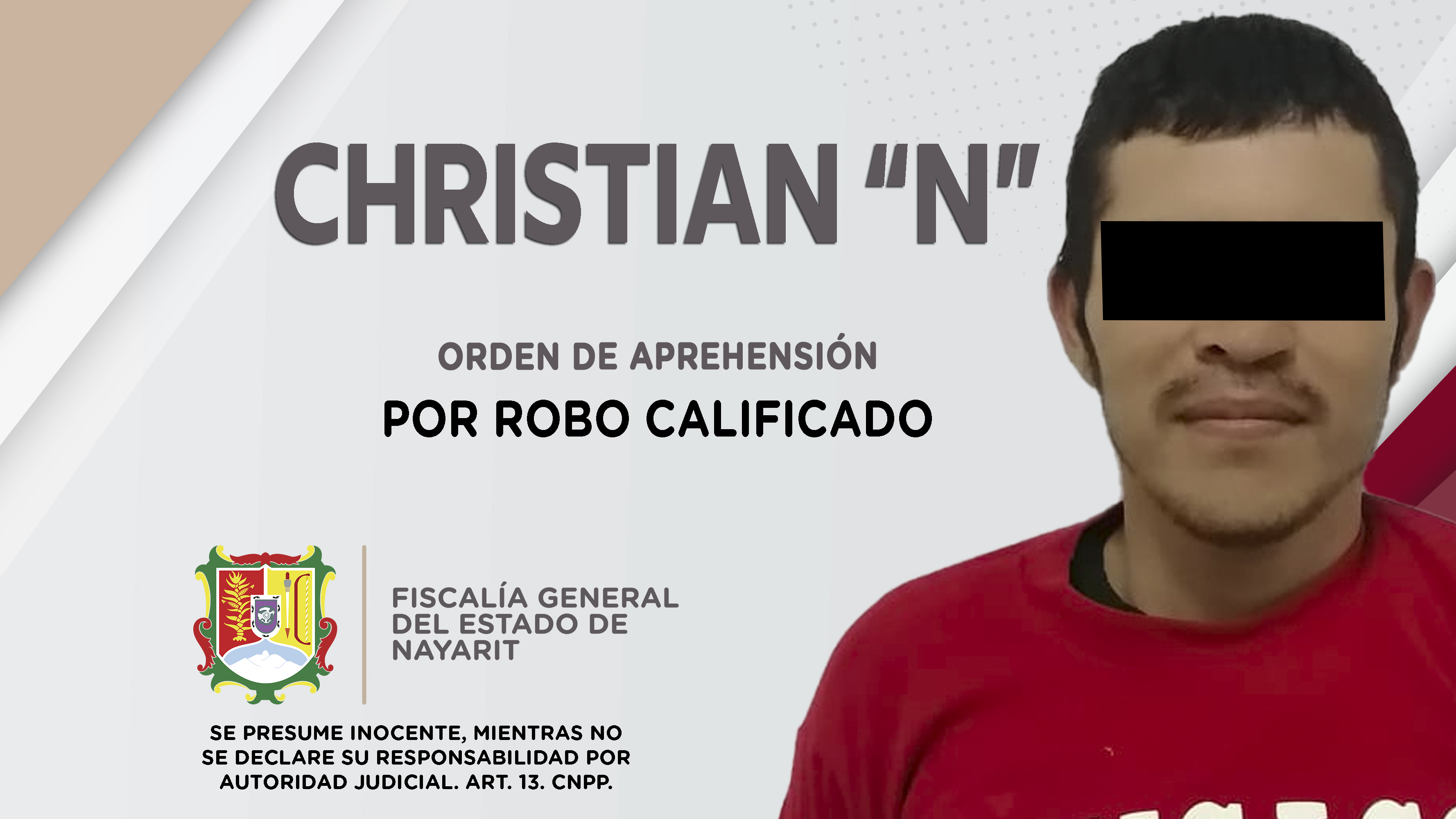 La Fiscalía General de Nayarit a través de la Agencia de Investigación Criminal, dio cumplimiento a una orden de aprehensión contra Christian “N”, en el municipio de Bahía de Banderas, por su probable responsabilidad penal en hechos que la ley s...