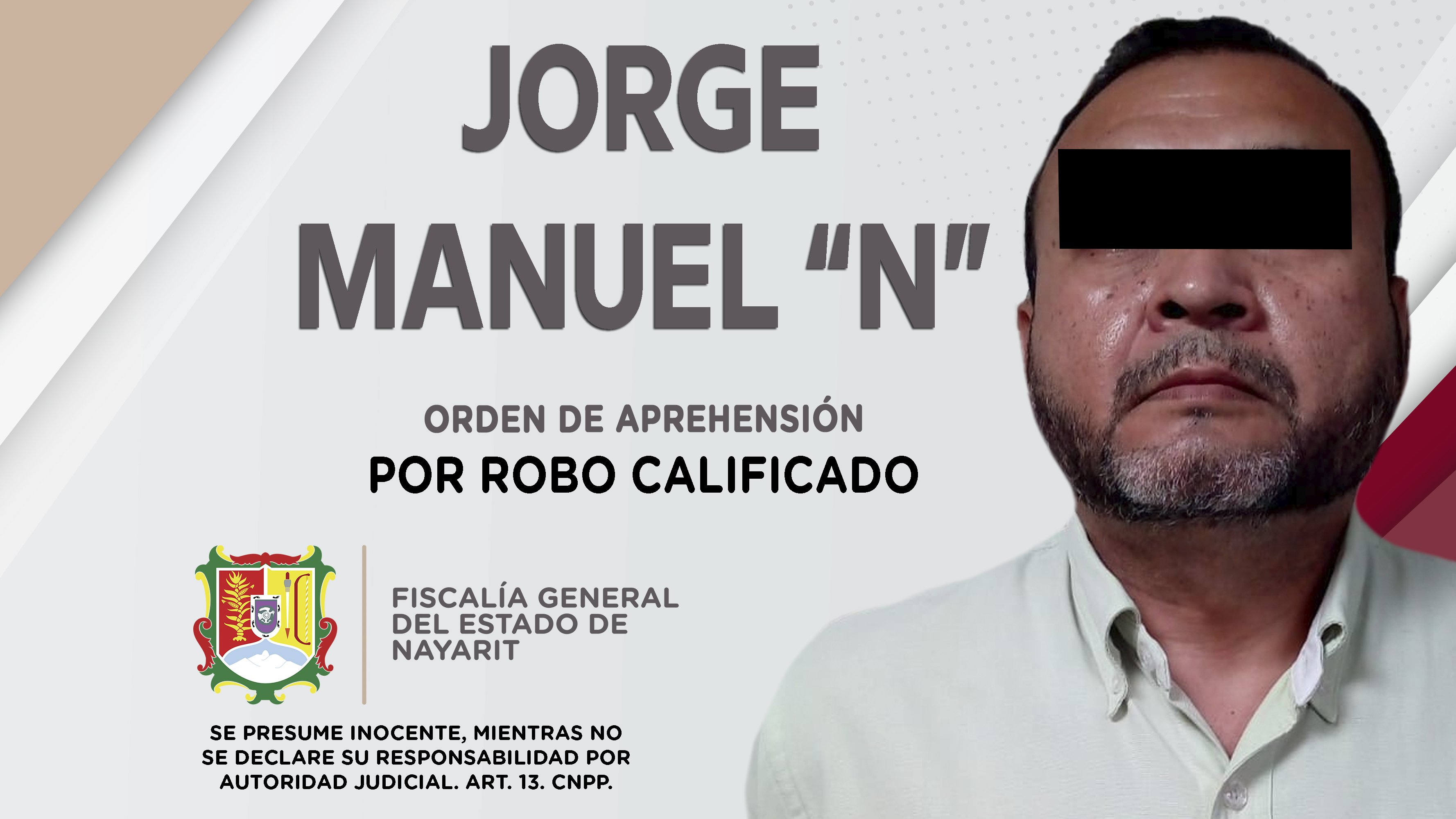 Elementos de la Agencia de Investigación Criminal ejecutaron una orden de aprehensión contra Jorge Manuel “N”, porque presumiblemente es responsable de hechos que la ley valora como delito de robo calificado, cometido en agravio de las empresas Pro...