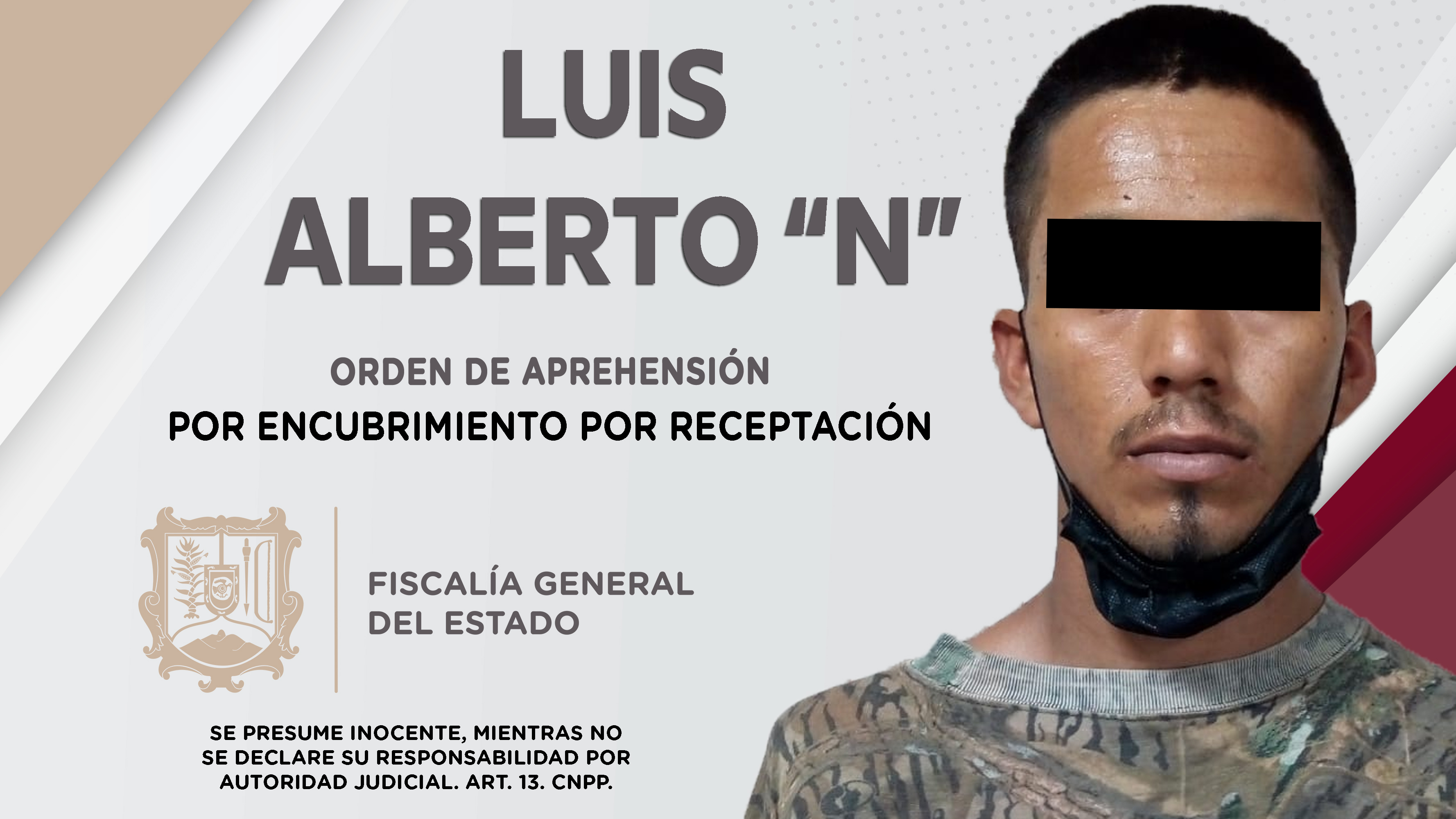 Elementos de la Agencia de Investigación Criminal ejecutaron una orden de aprehensión contra Luis Alberto “N”, por su probable responsabilidad penal en hechos que para la ley constituyen el delito de encubrimiento por receptación, cometido en agra...