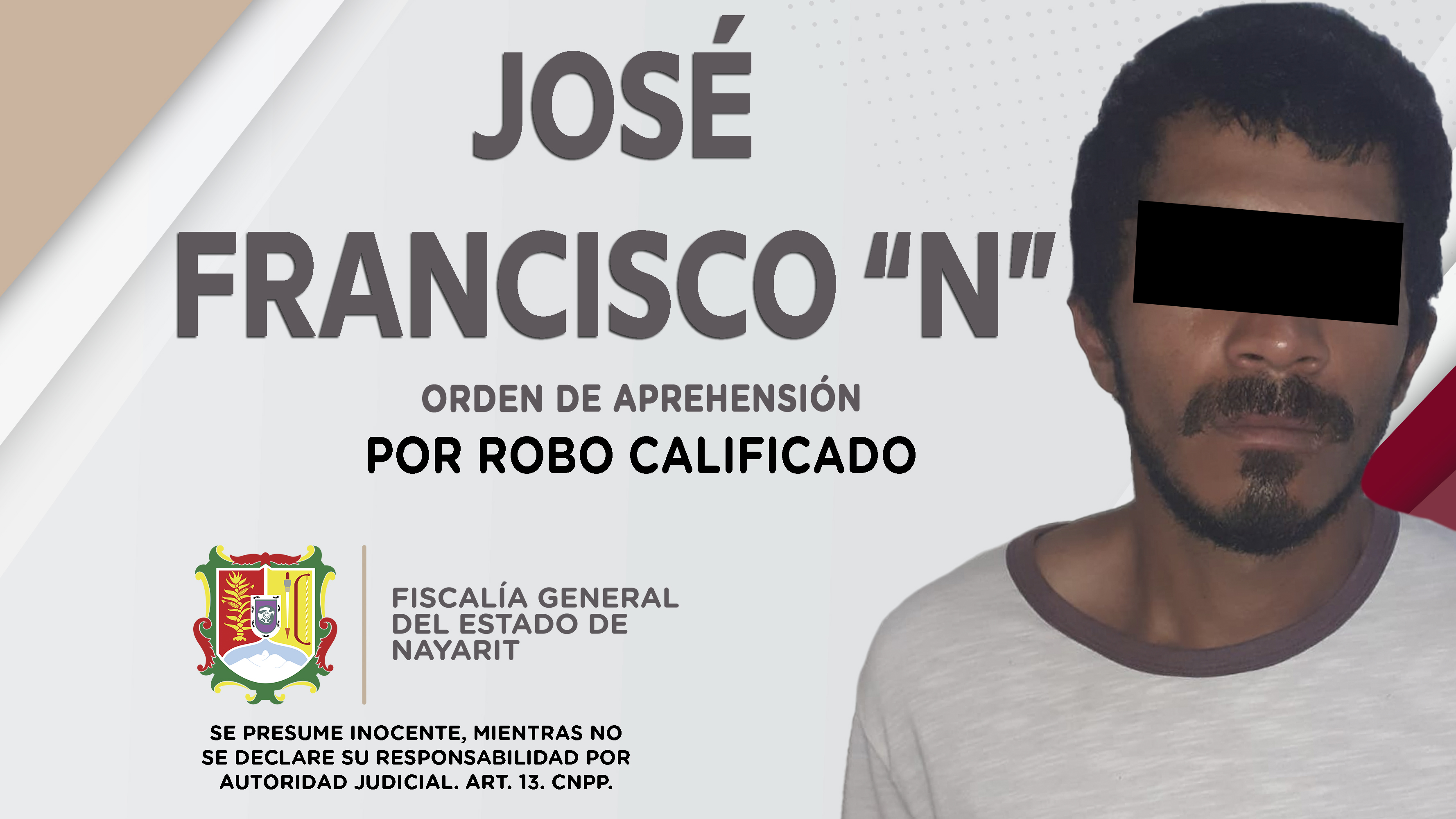 Elementos de la Agencia de Investigación Criminal ejecutaron una orden de aprehensión en la zona Centro de San Blas contra José Francisco “N”, porque presumiblemente es responsable de hechos que la ley valora como delito de robo calificado, cometi...
