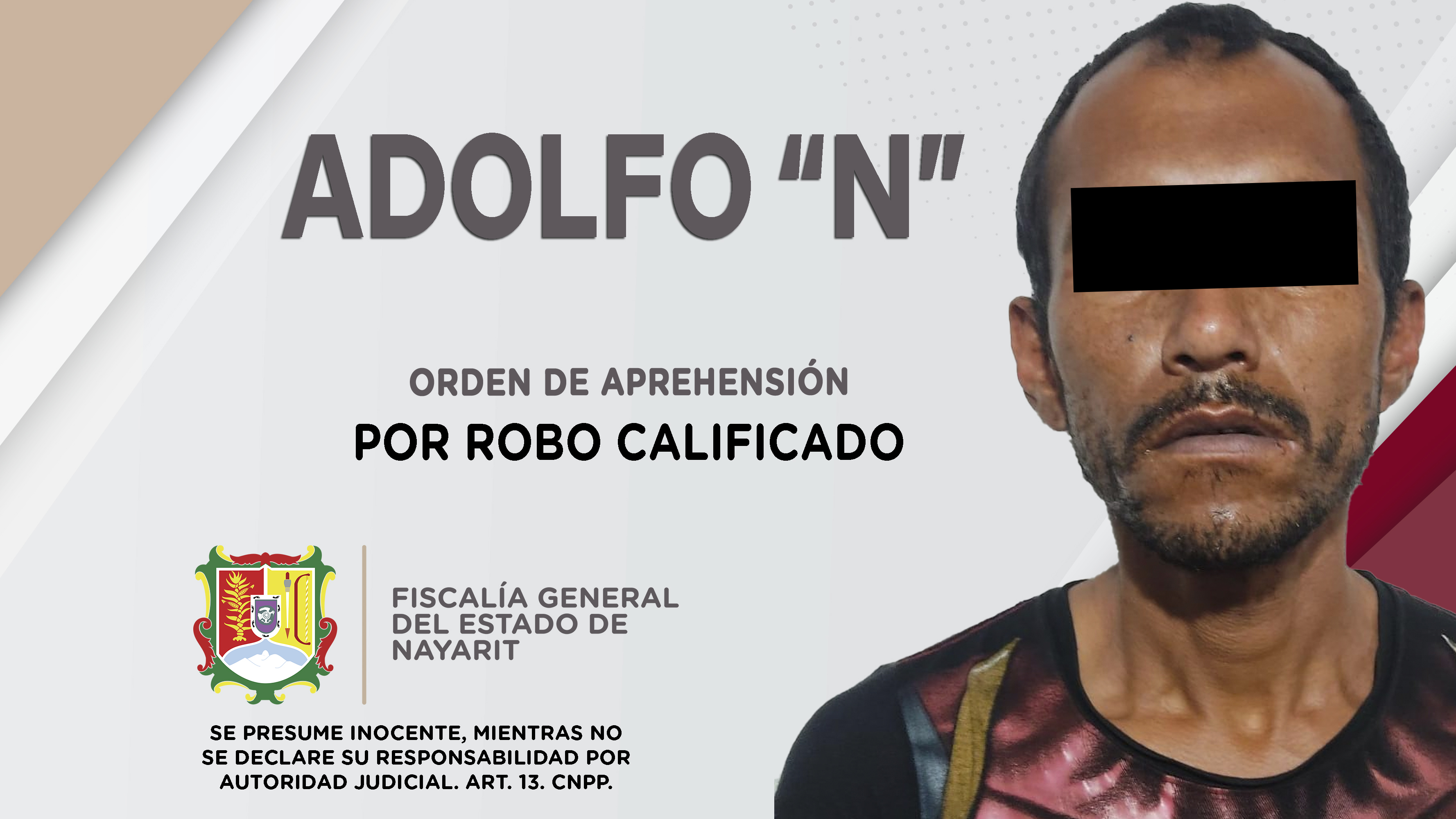 Elementos de la Agencia de Investigación Criminal ejecutaron una orden de aprehensión contra Adolfo “N”, porque presumiblemente es responsable de hechos que la ley valora como delito de robo calificado, cometido en perjuicio de una persona de sexo ...