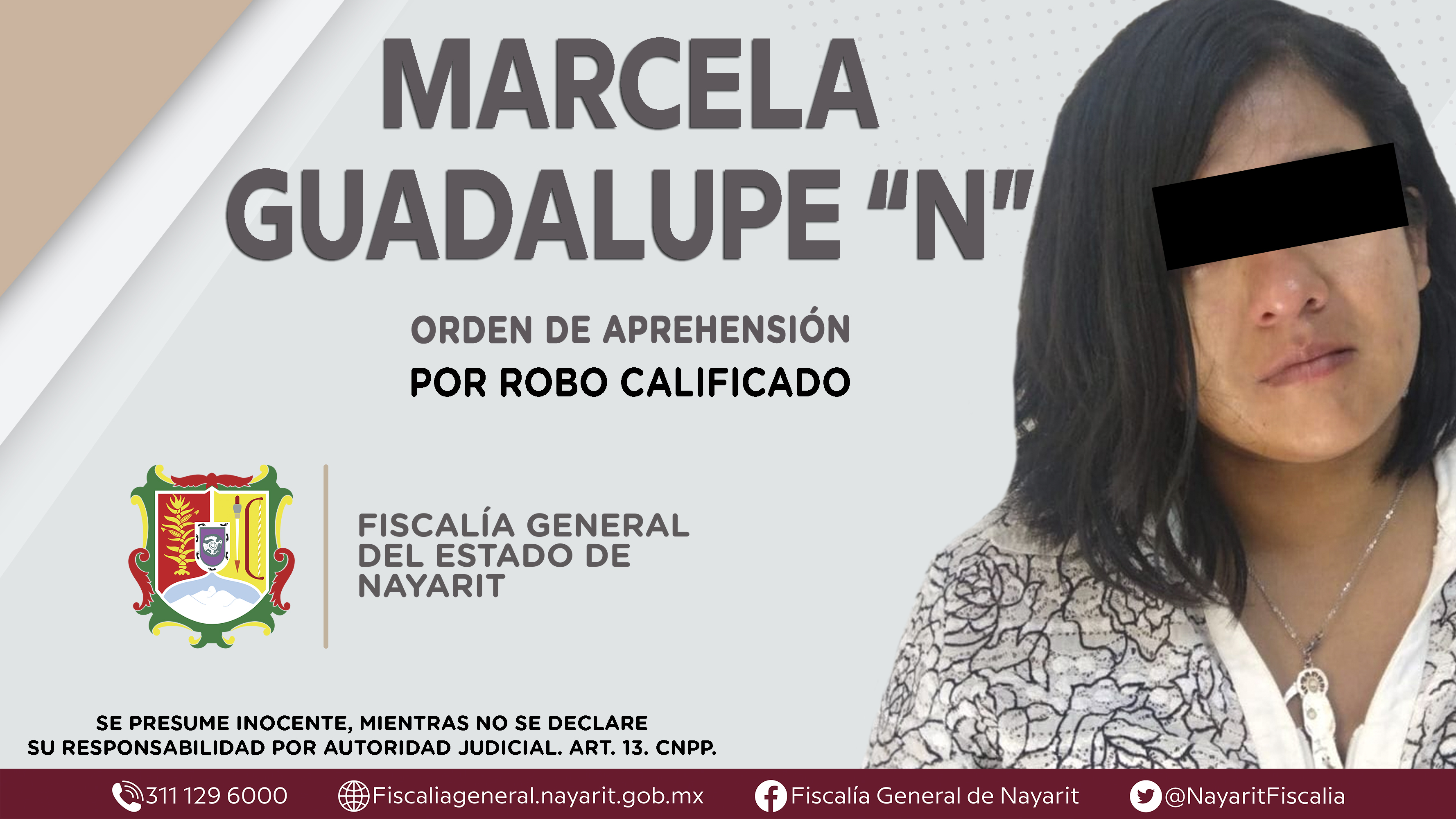 La Fiscalía General de Nayarit a través de la Agencia de Investigación Criminal dio cumplimiento a una orden de aprehensión en la capital nayarita contra Marcela Guadalupe “N”, por su presunta participación en hechos que según apreciación de l...