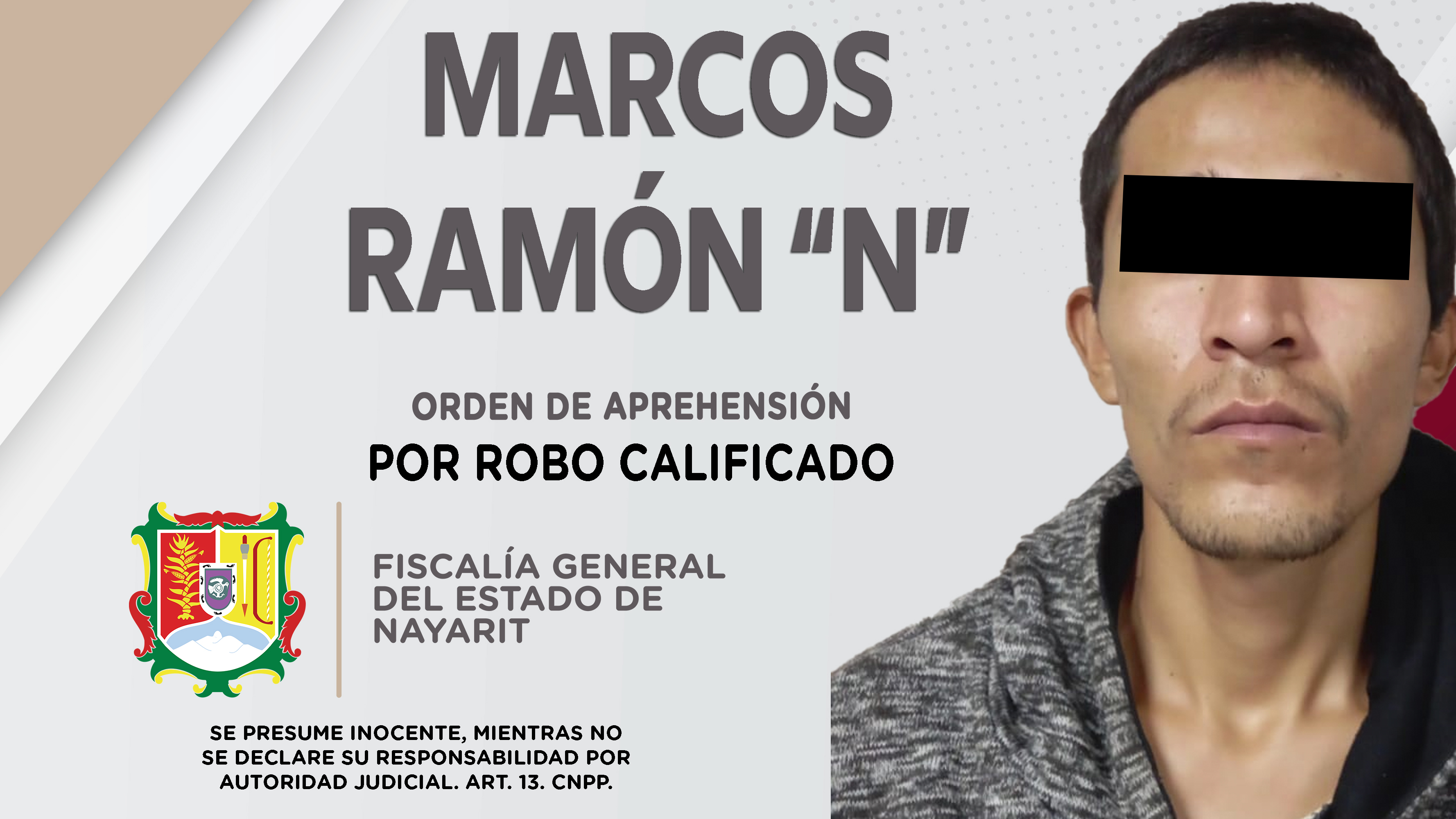 Fiscalía General de Nayarit a través de la Agencia de Investigación Criminal, dio cumplimiento a una orden de aprehensión contra Marcos Ramón “N”, porque se presume su responsabilidad en hechos que para la ley configuran el delito de robo califi...