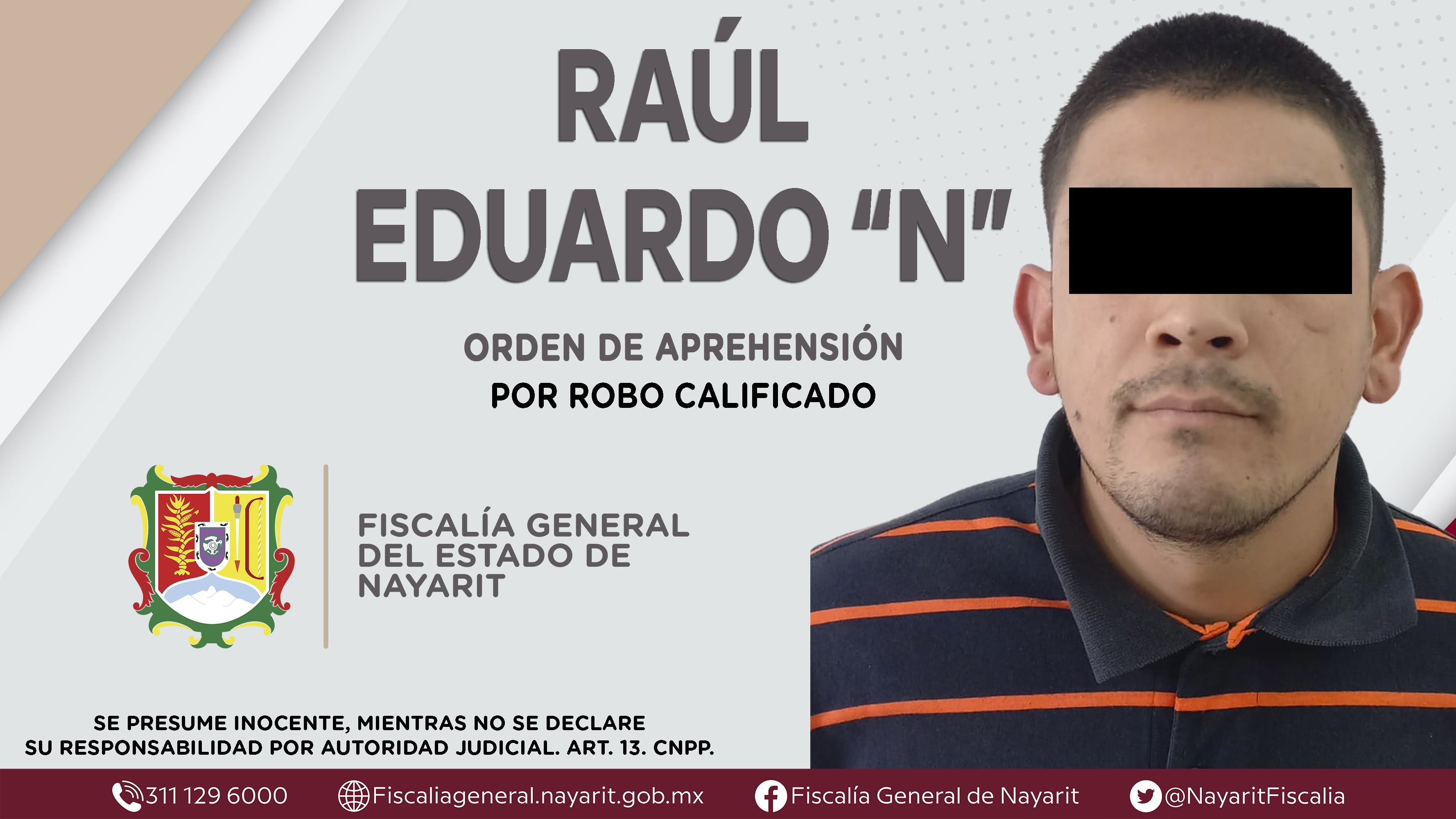 Elementos de la Agencia de Investigación Criminal de Nayarit ejecutaron una orden de aprehensión en la capital nayarita contra Raúl Eduardo “N”, por su presunta participación en hechos que según apreciación de la ley encuadran el delito de robo...
