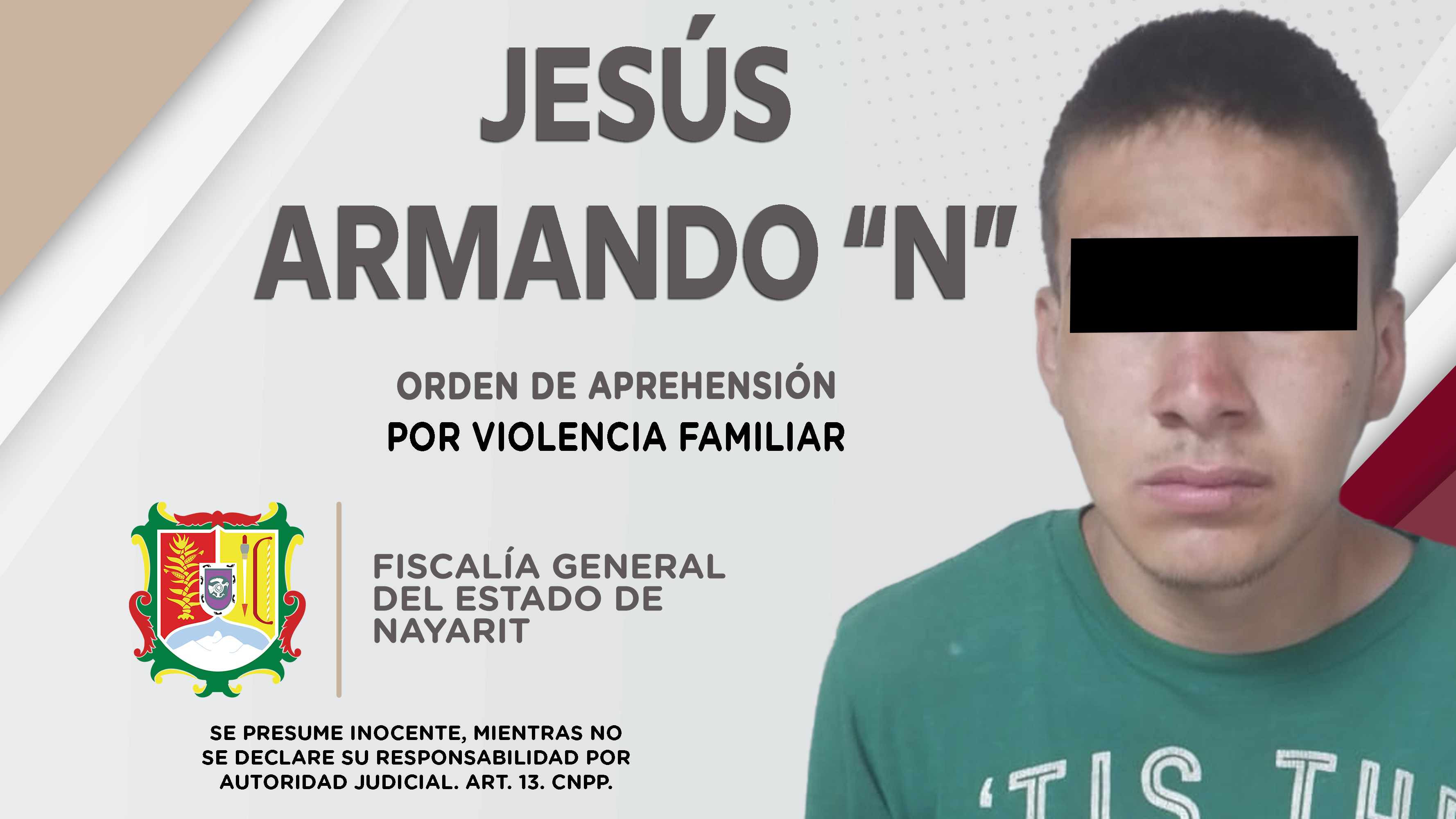 Fiscalía General de Nayarit a través de la Agencia de Investigación Criminal, ejecutó una orden de aprehensión contra Jesús Armando “N”, por su probable responsabilidad penal en hechos que para la ley constituyen el delito de violencia familiar...