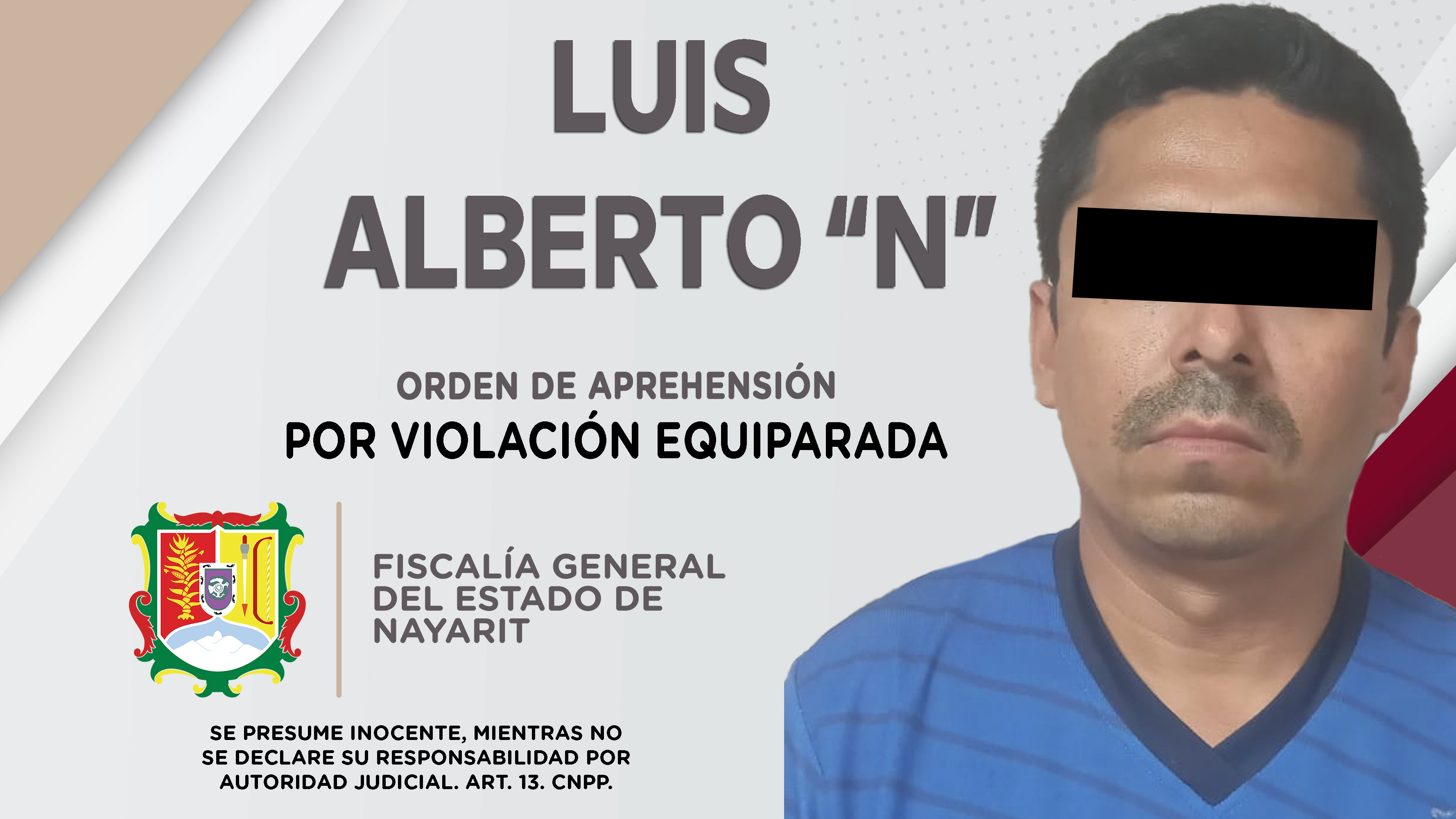 Fiscalía General de Nayarit a través de la Agencia de Investigación Criminal, ejecutó una orden de aprehensión contra Luis Alberto “N”, por su probable responsabilidad penal en hechos que para la ley constituyen el delito de violación equiparad...