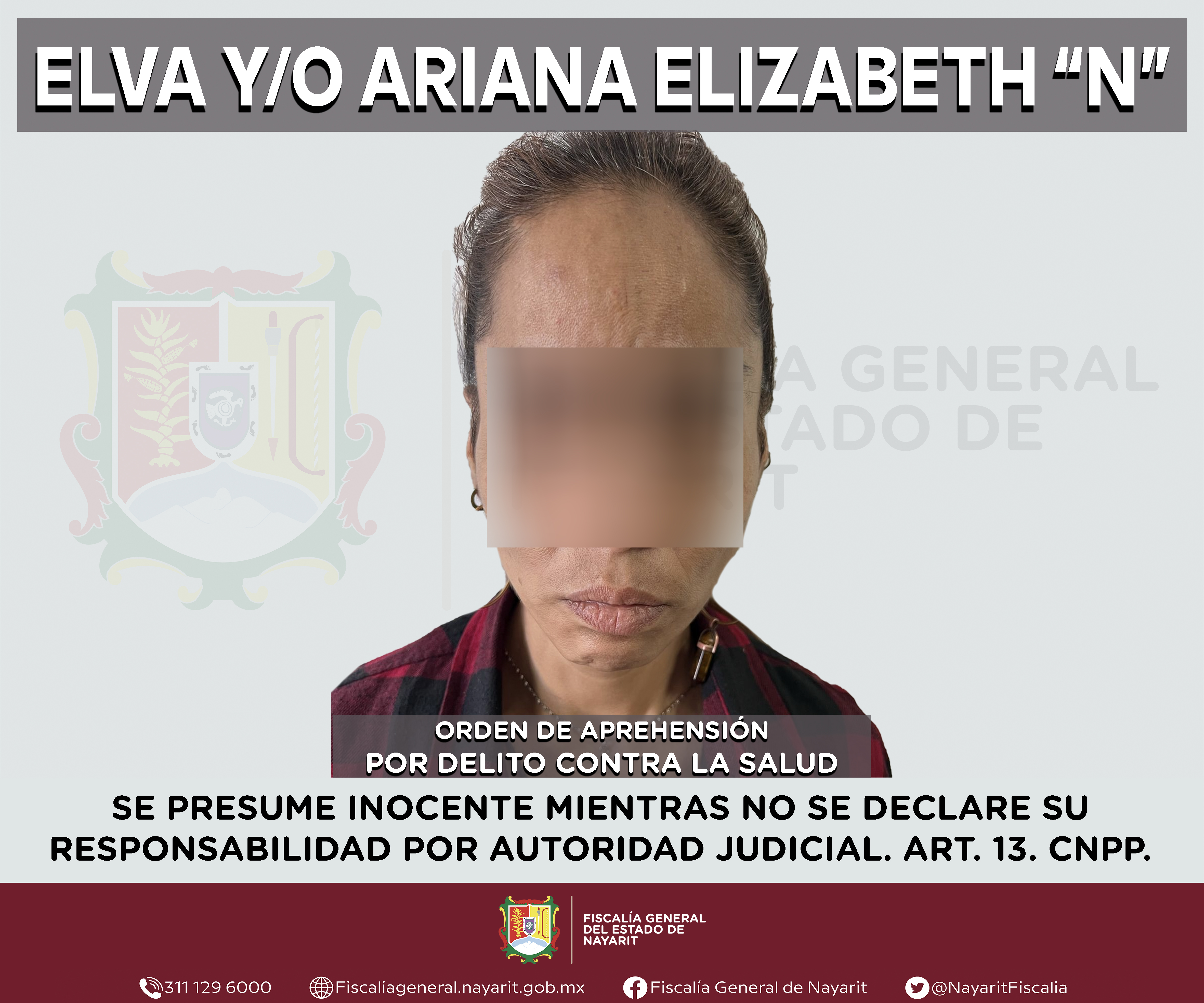 Elementos de la Agencia de Investigación Criminal de Nayarit ejecutaron una orden de aprehensión en la capital nayarita contra Elva “N” y/o Ariana Elizabeth “N”, por su presunta participación en hechos que según apreciación de la ley encuadr...