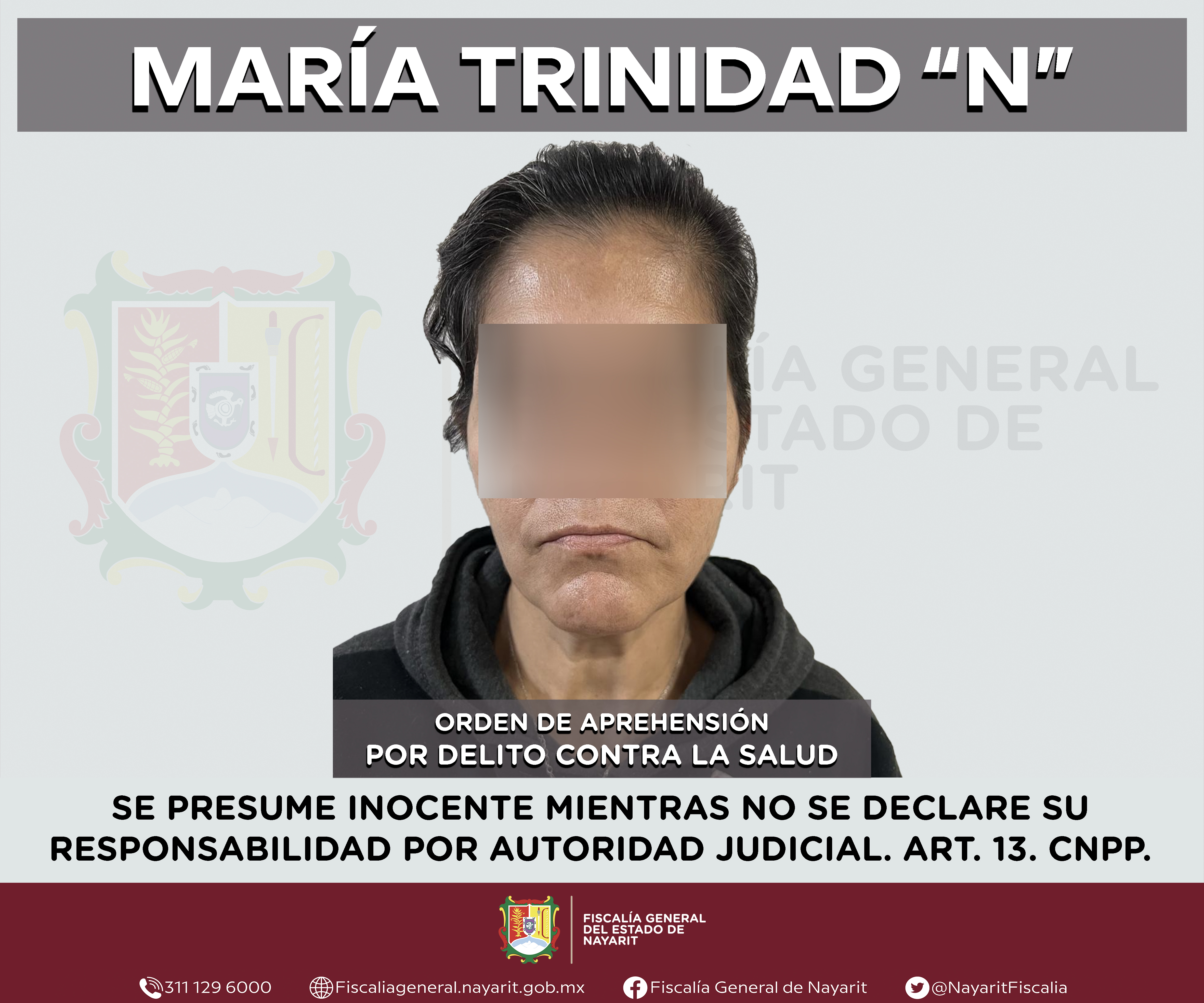 Elementos de la Agencia de Investigación Criminal de Nayarit ejecutaron una orden de aprehensión en la capital nayarita contra María Trinidad “N”, por su presunta participación en hechos que según apreciación de la ley encuadran el delito contr...