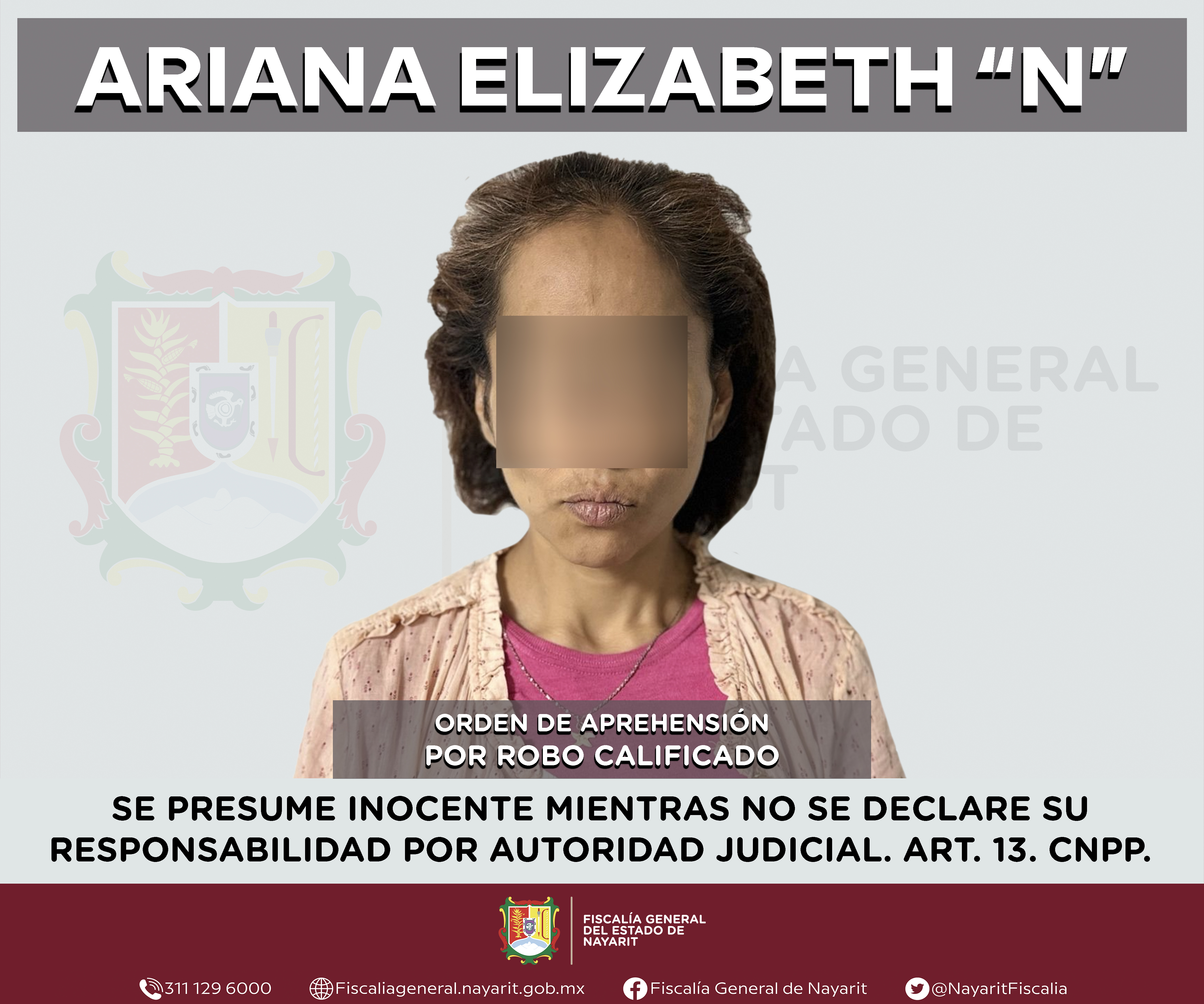 Elementos de la Agencia de Investigación Criminal de Nayarit ejecutaron una orden de aprehensión en la capital nayarita contra Ariana Elizabeth “N”, por su presunta participación en hechos que según apreciación de la ley encuadran el delito de r...