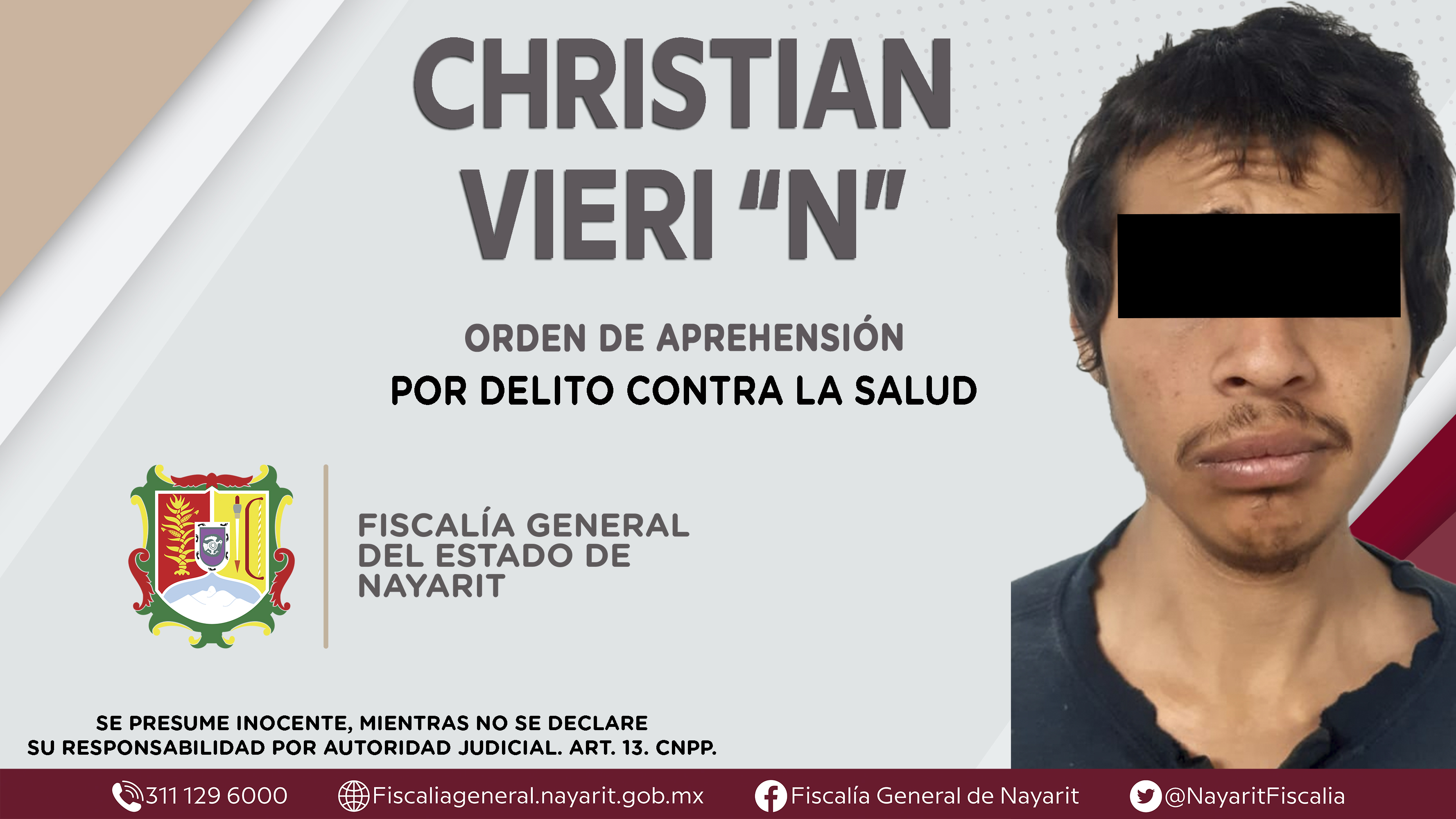 La Fiscalía General de Nayarit a través de la Agencia de Investigación Criminal dio cumplimiento a una orden de aprehensión en la ciudad de Tepic contra Christian Vieri “N”, por su presunta participación en hechos que según apreciación de la l...