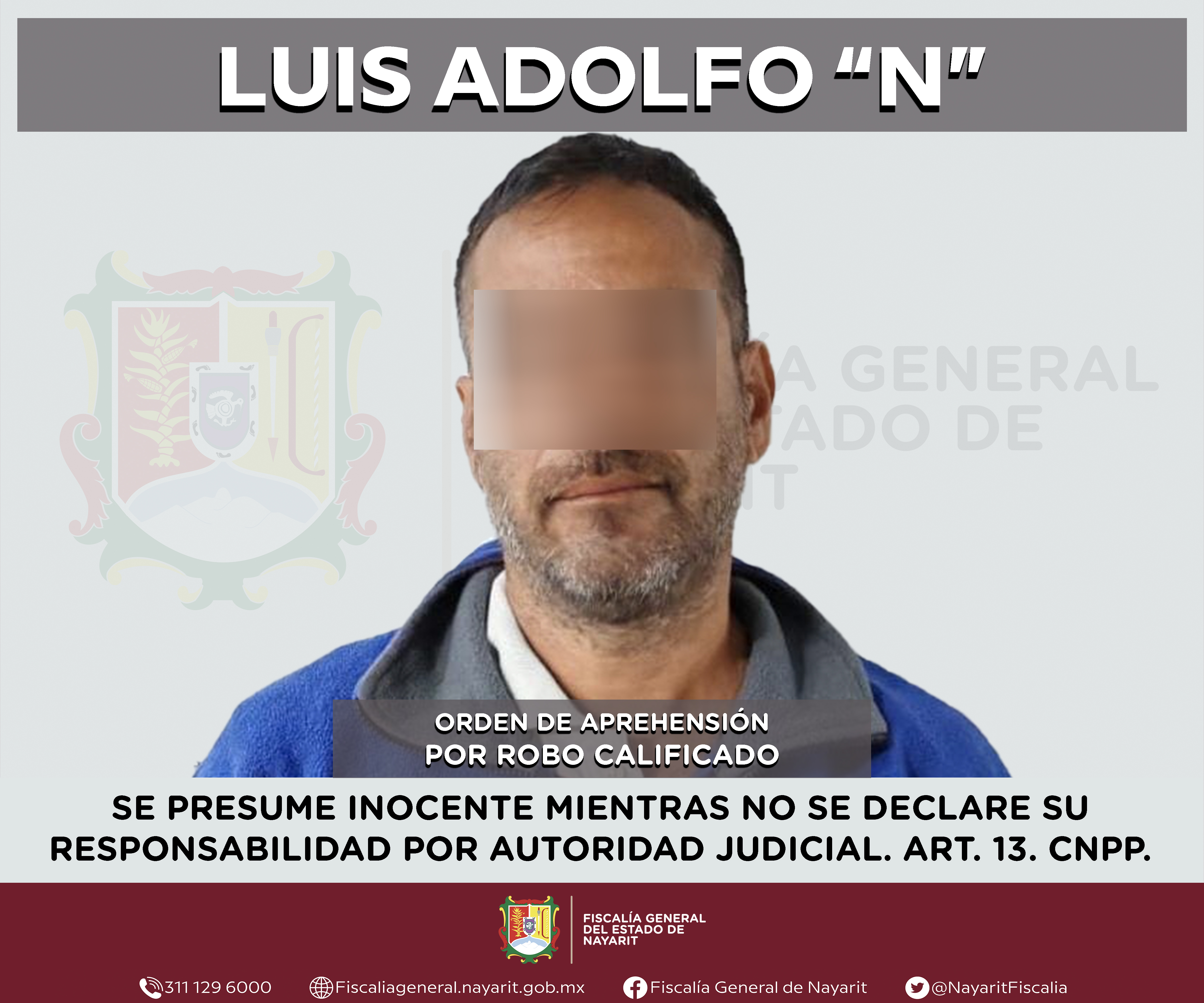 La Fiscalía General de Nayarit a través de la Agencia de Investigación Criminal ejecutó una orden de aprehensión en la ciudad de Tepic contra Luis Adolfo “N”, por su probable participación en hechos que para la ley configuran el delito de robo ...