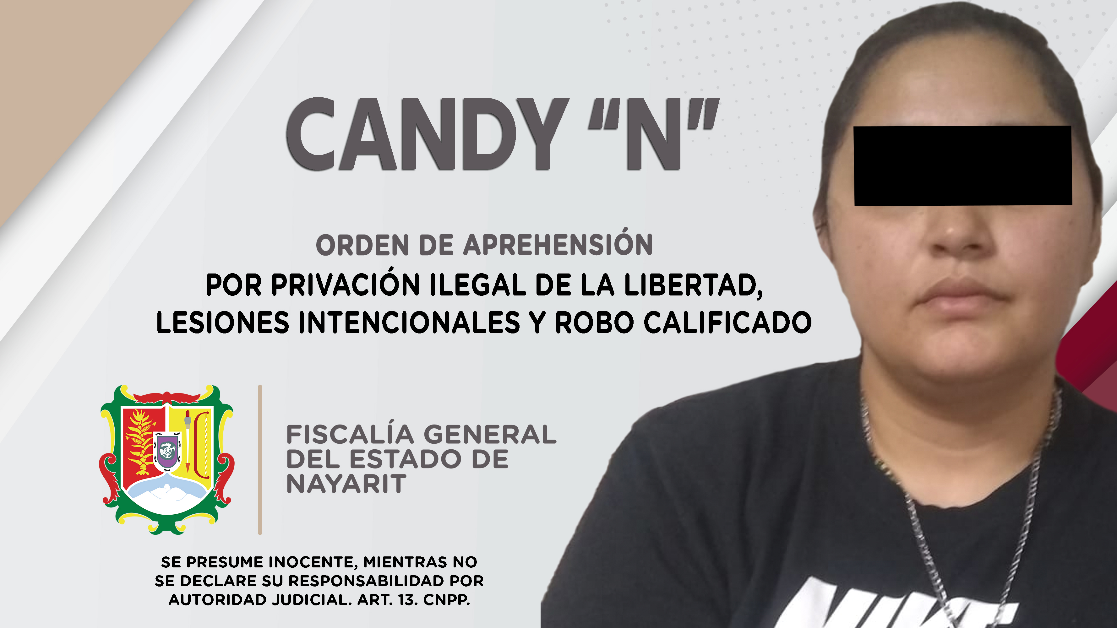 En el poblado San Cayetano, municipio de Tepic, elementos de la Agencia de Investigación Criminal cumplimentaron una orden de aprehensión contra Candy “N”, de quien se presume su responsabilidad en hechos que revisten las características del delit...
