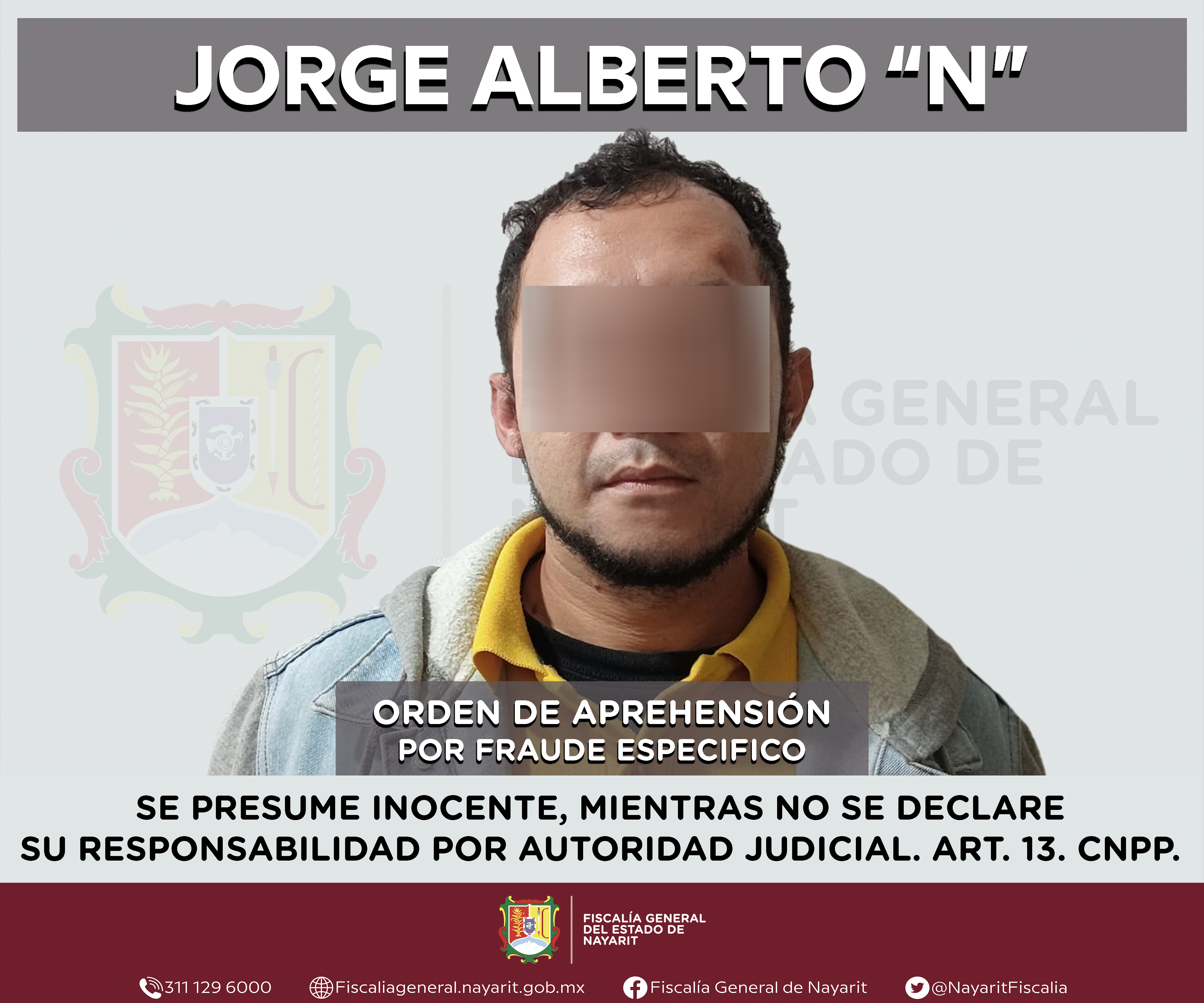 La Fiscalía General del Estado a través de la Agencia de Investigación Criminal cumplimentó una orden de aprehensión en el municiupio de Compostela contra Jorge Alberto “N”, por su presunta participación en hechos que bajo apreciación de la le...
