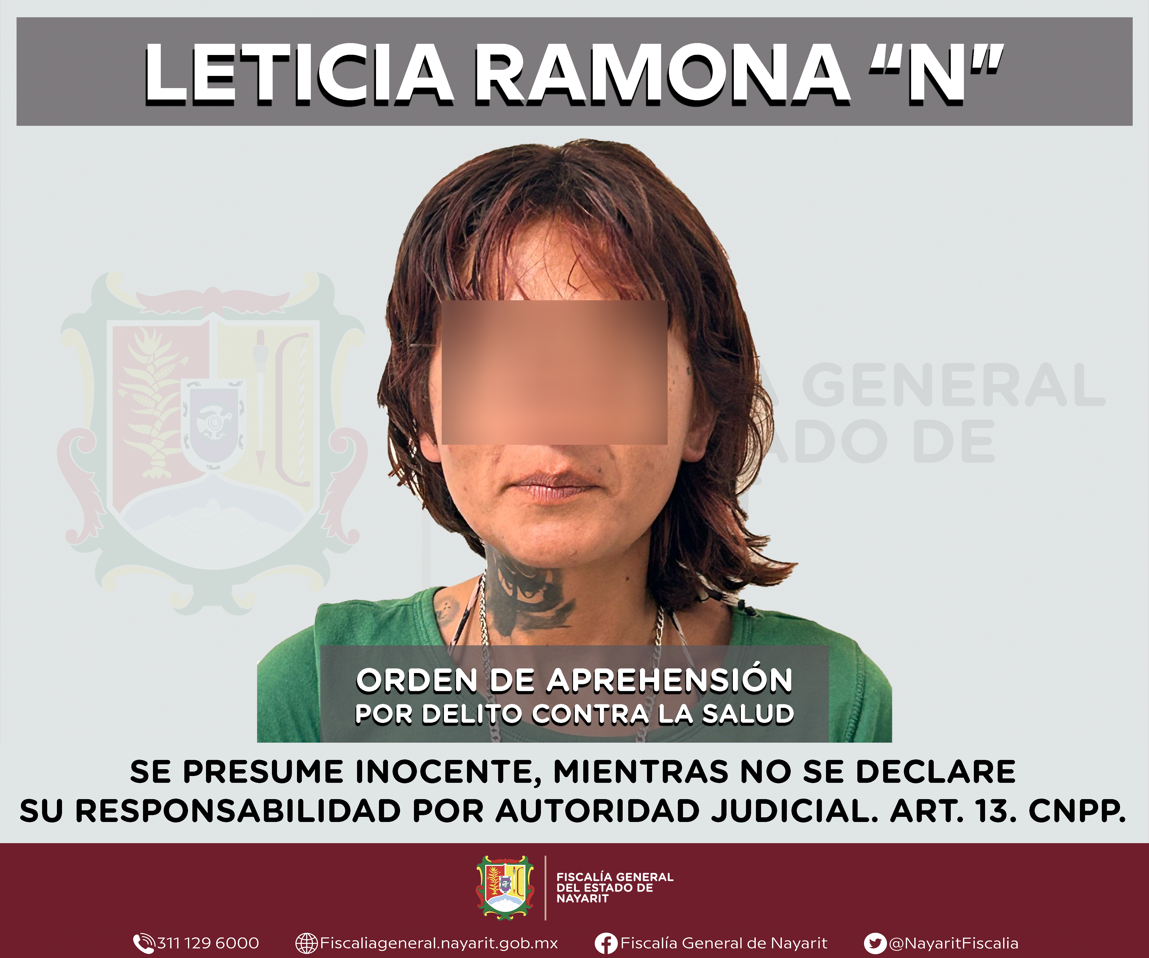 La Fiscalía General del estado de Nayarit a través de la Agencia de Investigación Criminal ejecutó una orden de aprehensión en la ciudad de Tepic contra Leticia Ramona “N”, por su presunta participación en hechos que según apreciación de la l...