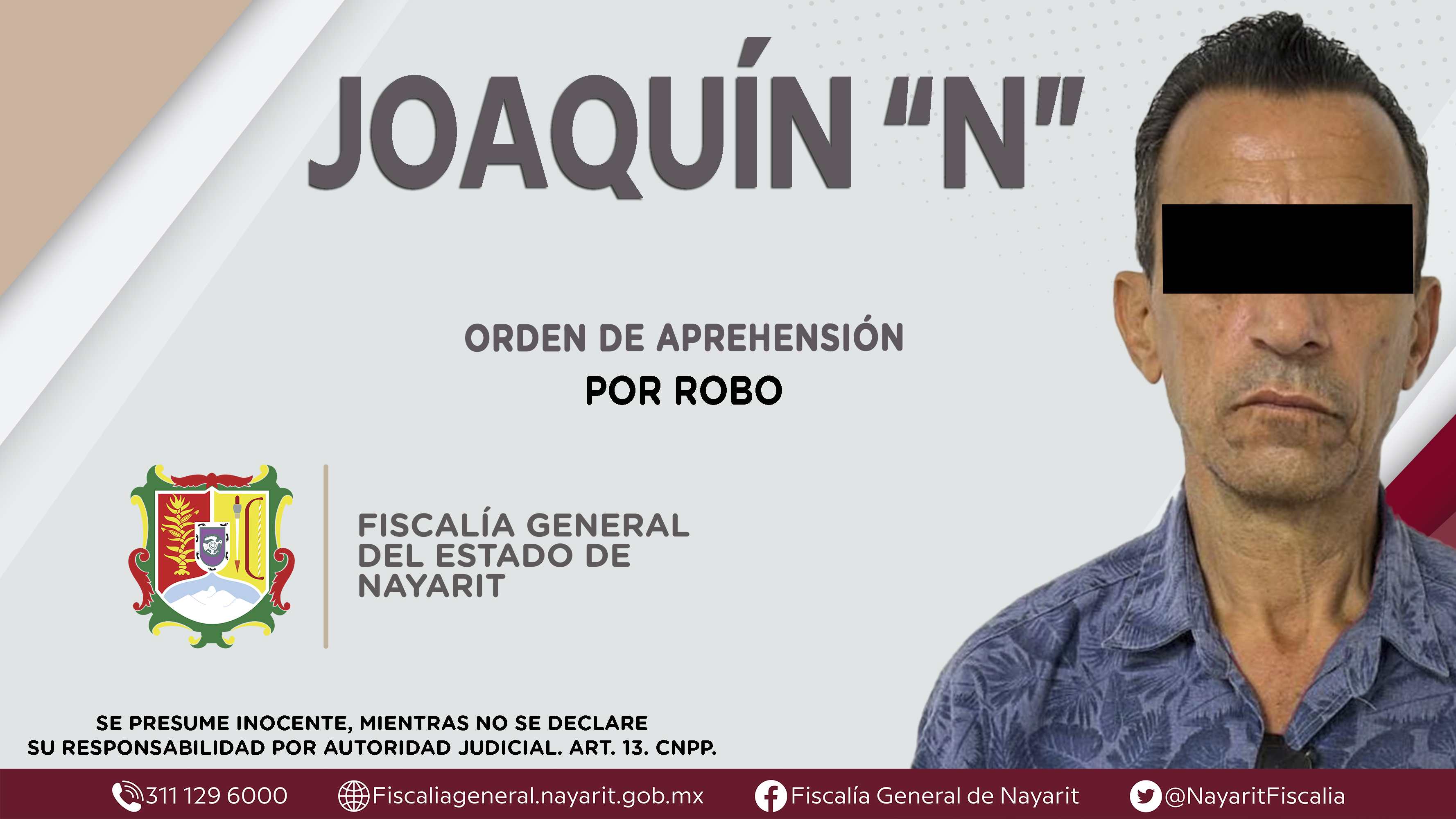 La Fiscalía General de Nayarit a través de la Agencia de Investigación Criminal dio cumplimiento a una orden de aprehensión contra Joaquín “N”, por su presunta participación en hechos que según apreciación de la ley encuadran el delito de rob...