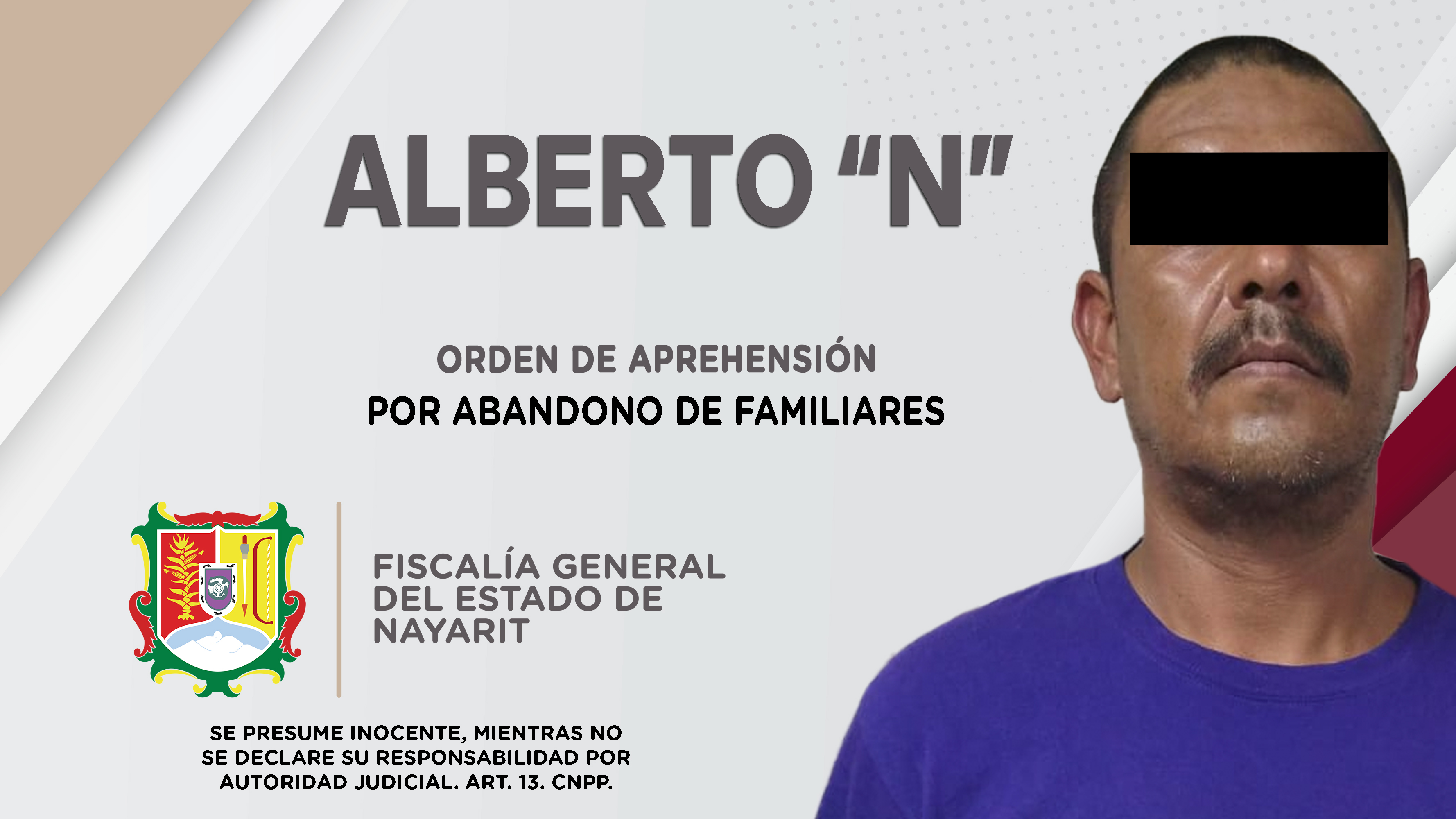 En el poblado San Cayetano, municipio de Tepic, elementos de la Agencia de Investigación Criminal cumplimentaron una orden de aprehensión contra Alberto “N”, como presunto responsable del delito de abandono de familiares, cometido en agravio de un ...