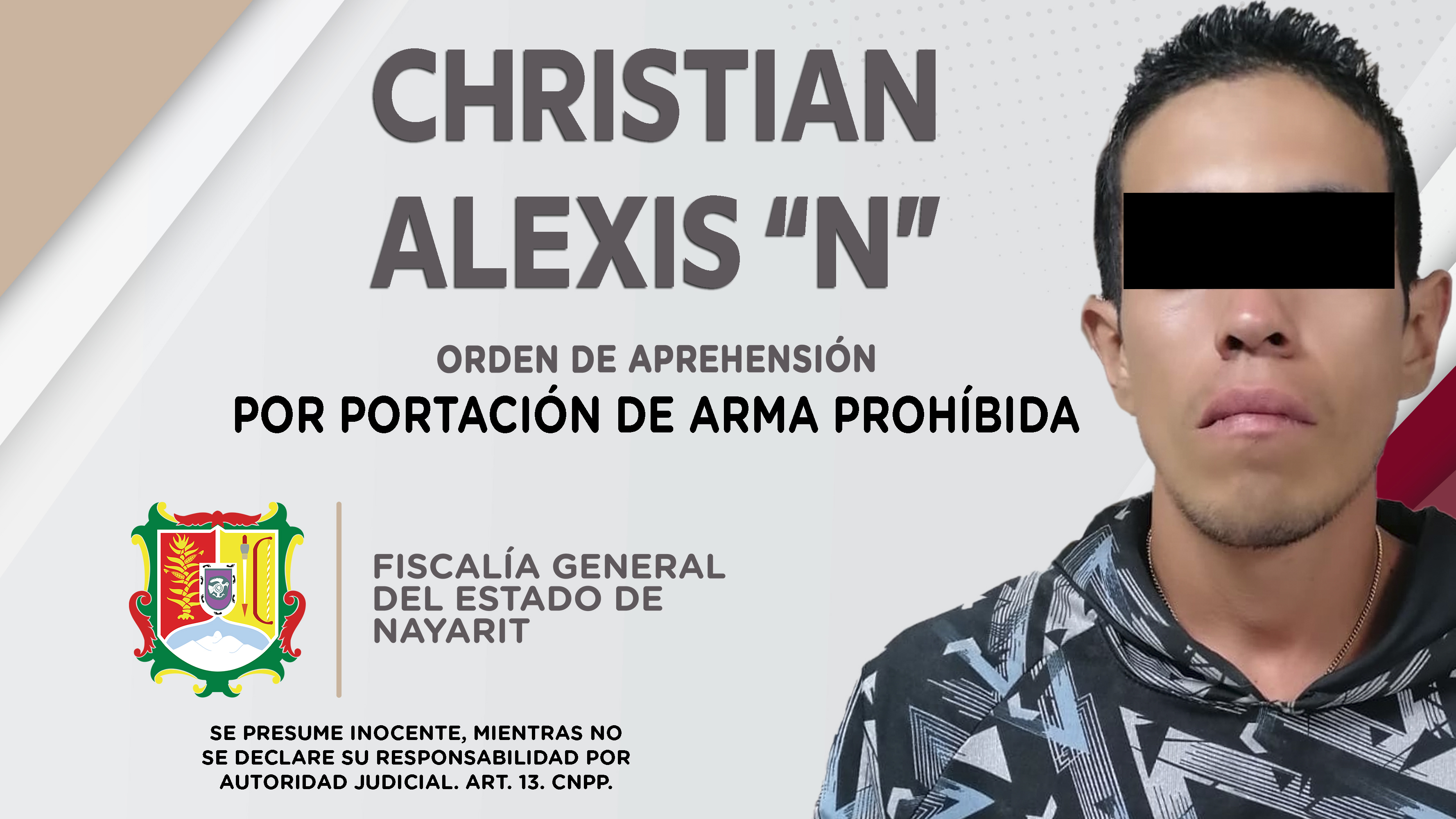 Elementos de la Agencia de Investigación Criminal cumplimentaron una orden de aprehensión en la capital nayarita contra Christian Alexis “N”, como presunto responsable del delito de portación de arma prohíbida, el cual fue cometido en agravio de ...