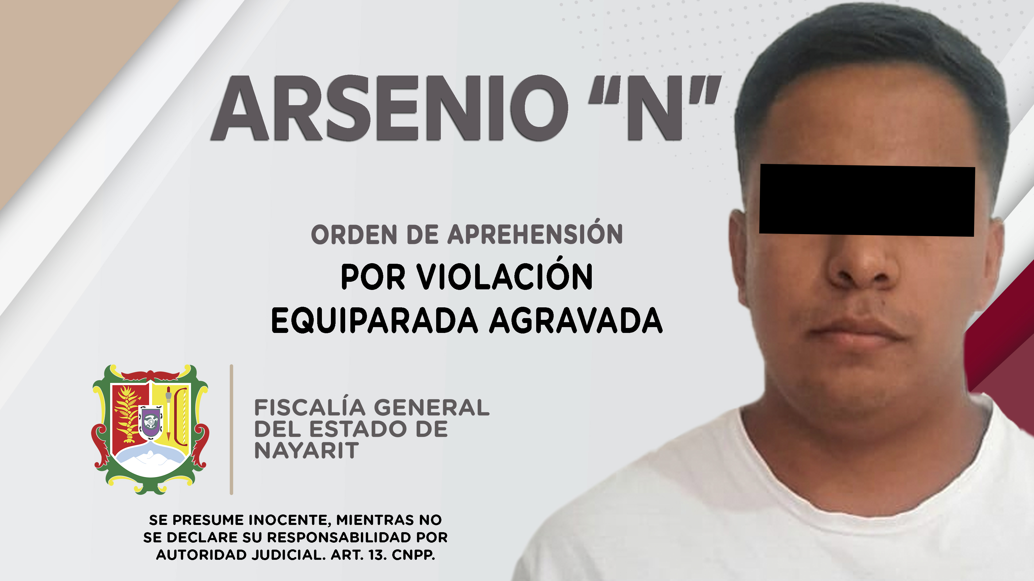 Elementos de la Agencia de Investigación Criminal ejecutaron una orden de aprehensión en el municipio de Santiago Ixcuintla contra Arsenio “N”, como presunto responsable del delito de violación equiparada agravada, cometido en agravio de una menor...