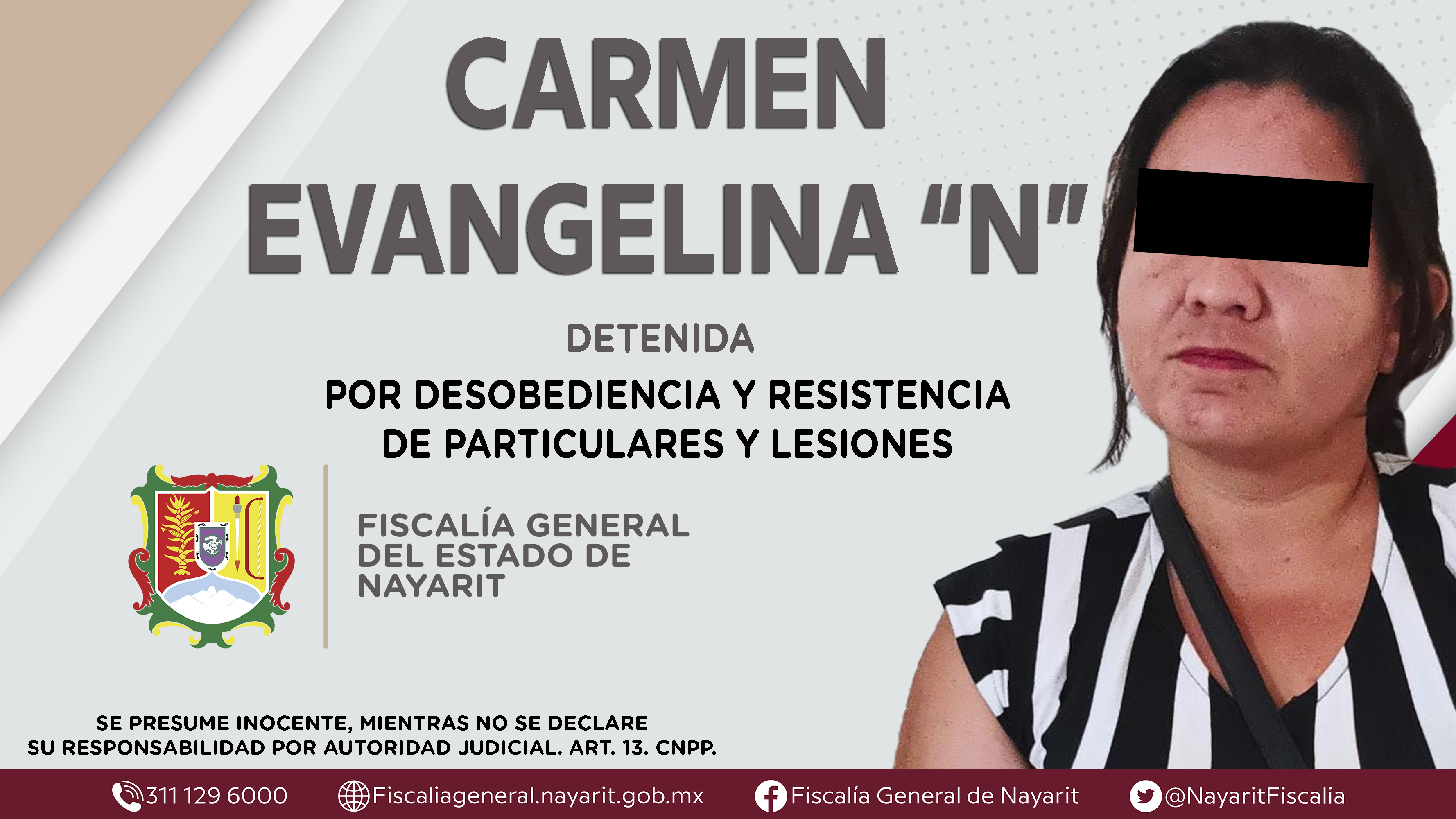 En el municipio de Santiago Ixcuintla, la Fiscalía General de Nayarit a través de la Agencia de Investigación Criminal detuvo a Carmen Evangelina “N”, por su presunta participación en hechos que según apreciación de la ley encuadran los delitos...