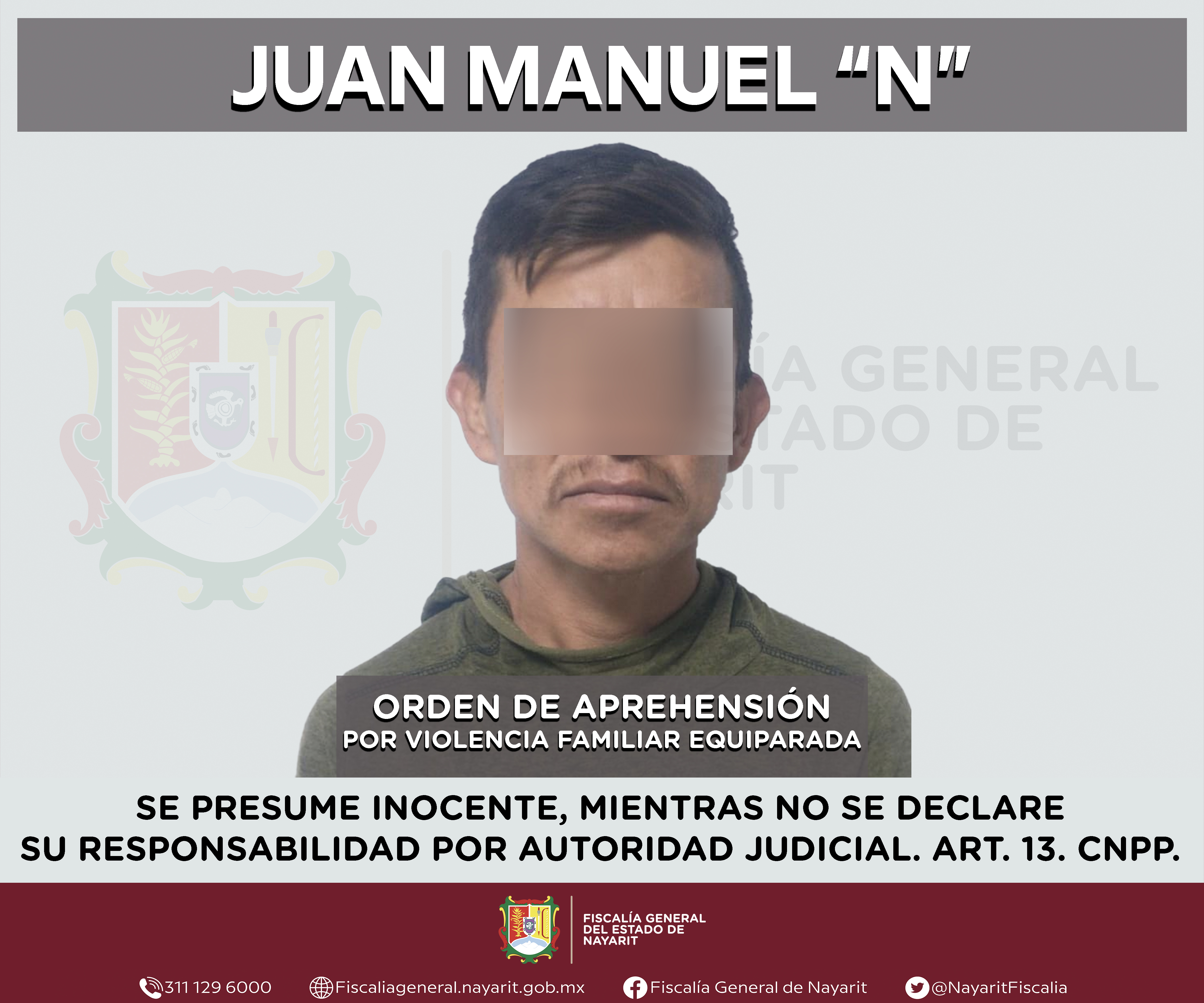 En la capital nayarita se cumplimentó una orden de aprehensión contra Juan Manuel “N”, por su presunta participación en hechos que según apreciación de la ley configuran el delito de violencia familiar equiparada, cometido en agravio de una pers...
