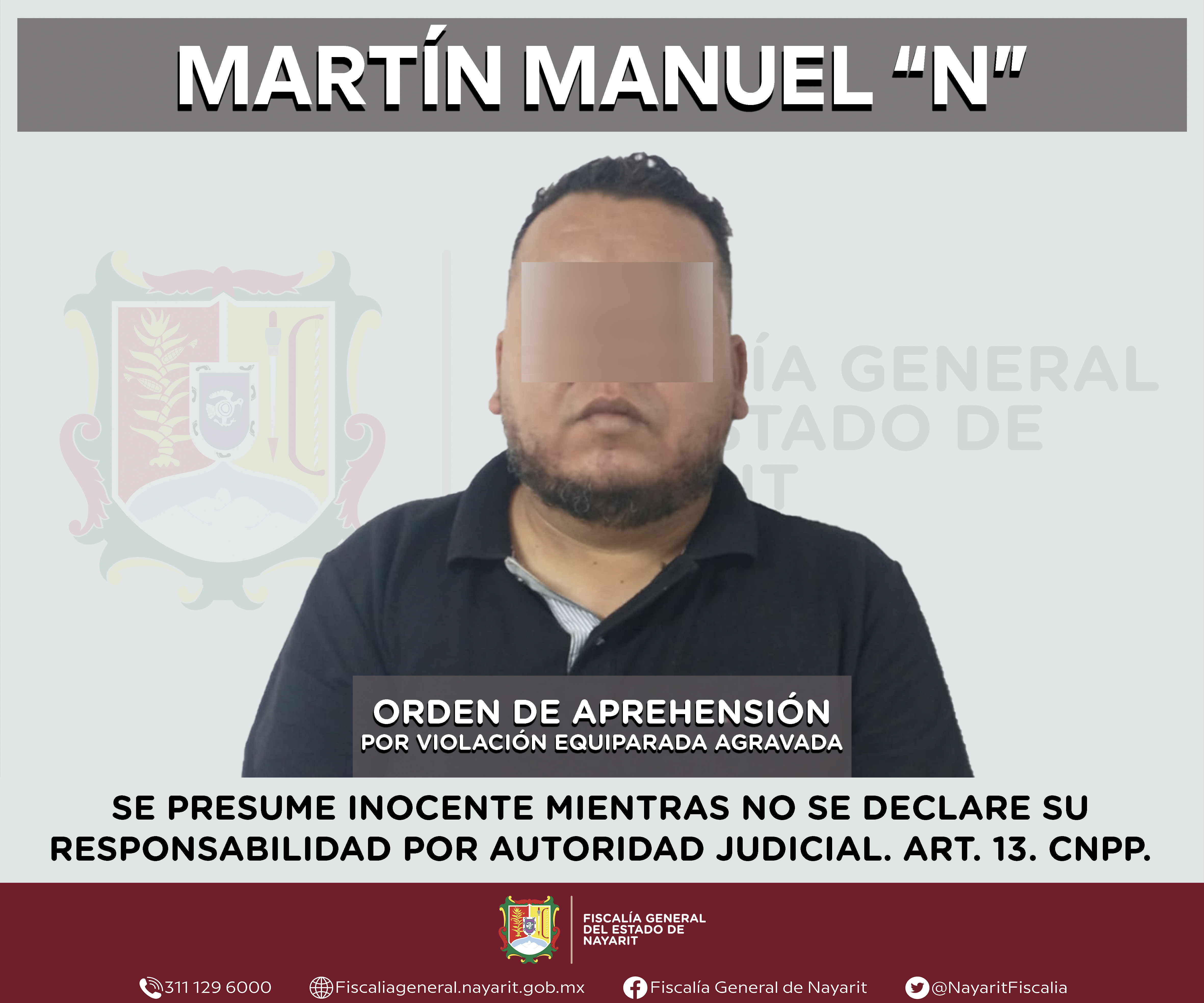 La Fiscalía General del estado de Nayarit a través de la Agencia de Investigación Criminal ejecutó una orden de aprehensión en la capital nayarita contra Martín Manuel “N”, por su presunta participación en hechos que según valoración de la l...