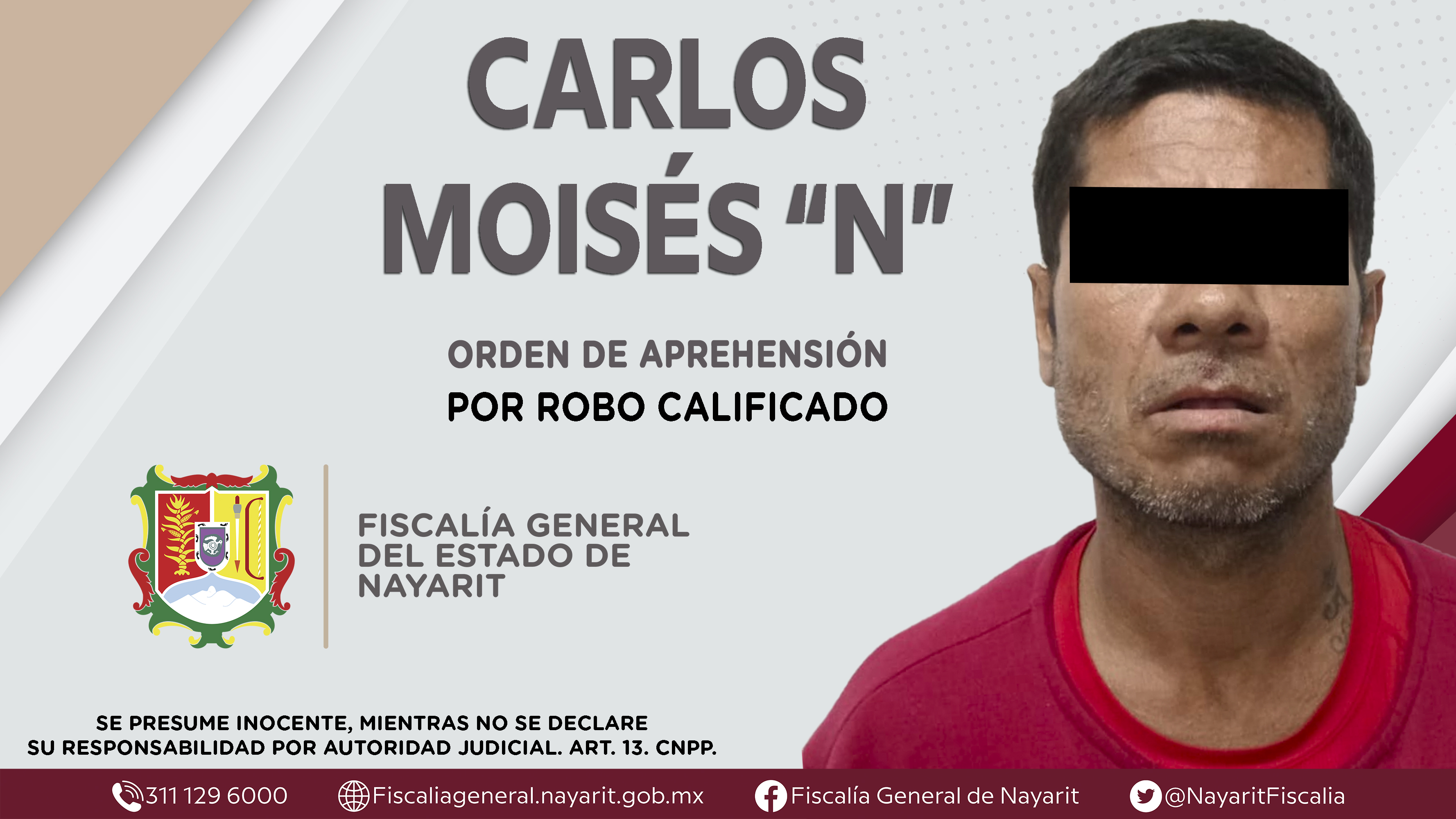 La Fiscalía General de Nayarit a través de la Agencia de Investigación Criminal dio cumplimiento a una orden de aprehensión en la ciudad de Tepic contra Carlos Moisés “N”, por su presunta participación en hechos que según apreciación de la le...