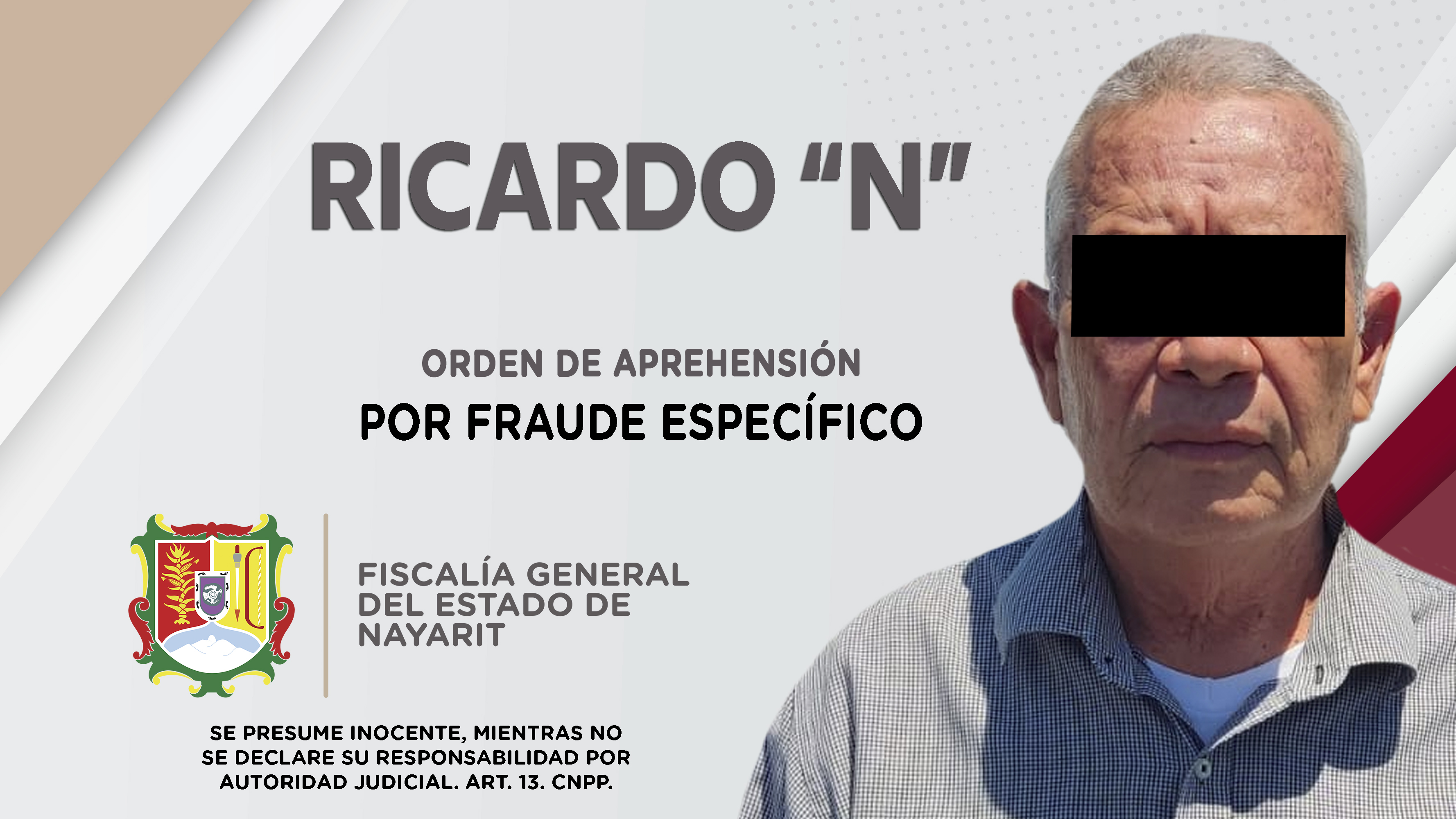 Fiscalía General de Nayarit a través de la Agencia de Investigación Criminal, ejecutó una orden de aprehensión en esta ciudad contra Ricardo “N”, originario del municipio de Santiago Ixcuintla y vecino de la capital nayarita, por su presunta par...