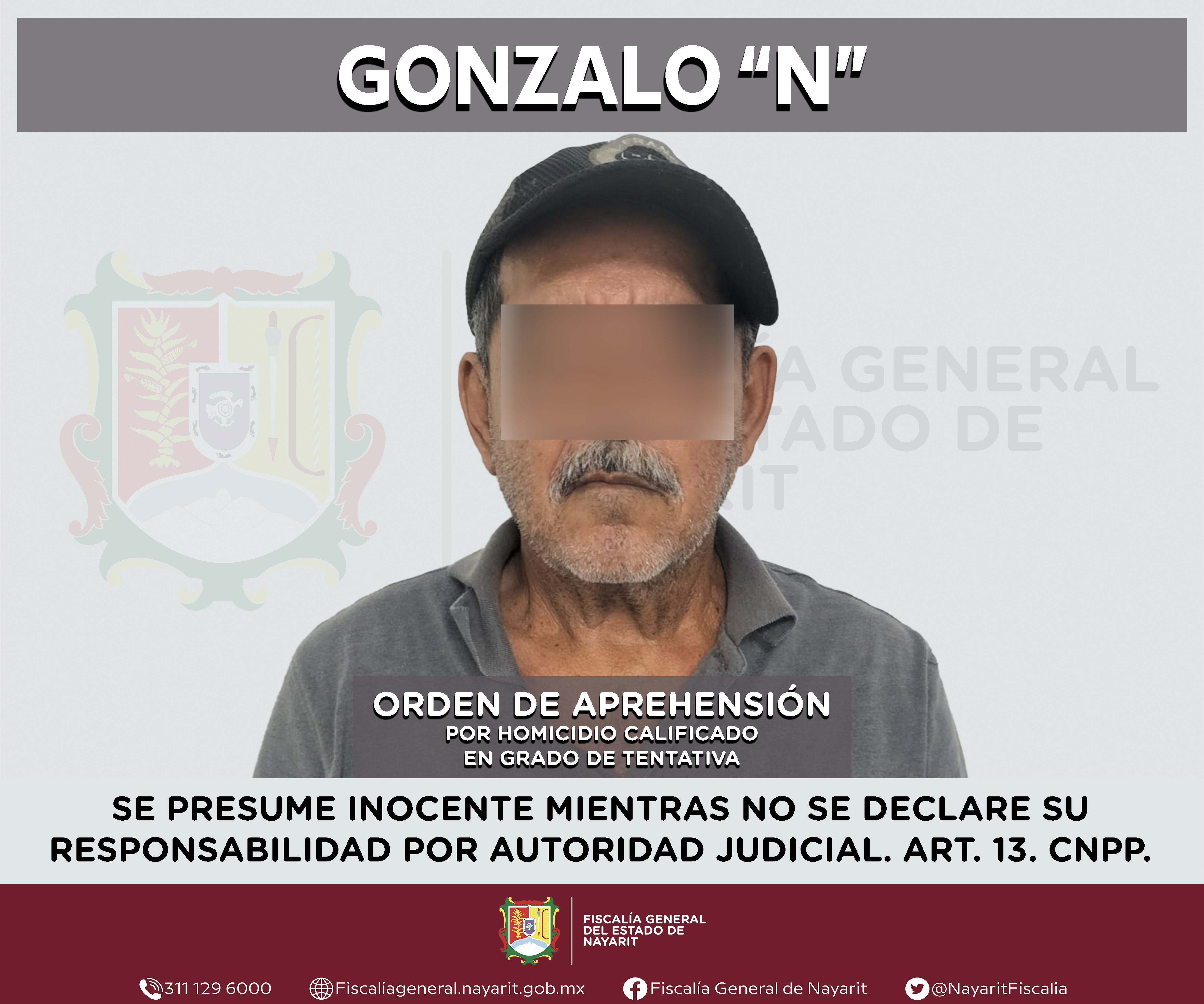 La Fiscalía General del estado de Nayarit a través de la Agencia de Investigación Criminal ejecutó una orden de aprehensión en la localidad Zacualpan, municipio de Compostela contra Gonzalo “N”, por su presunta participación en hechos que segú...