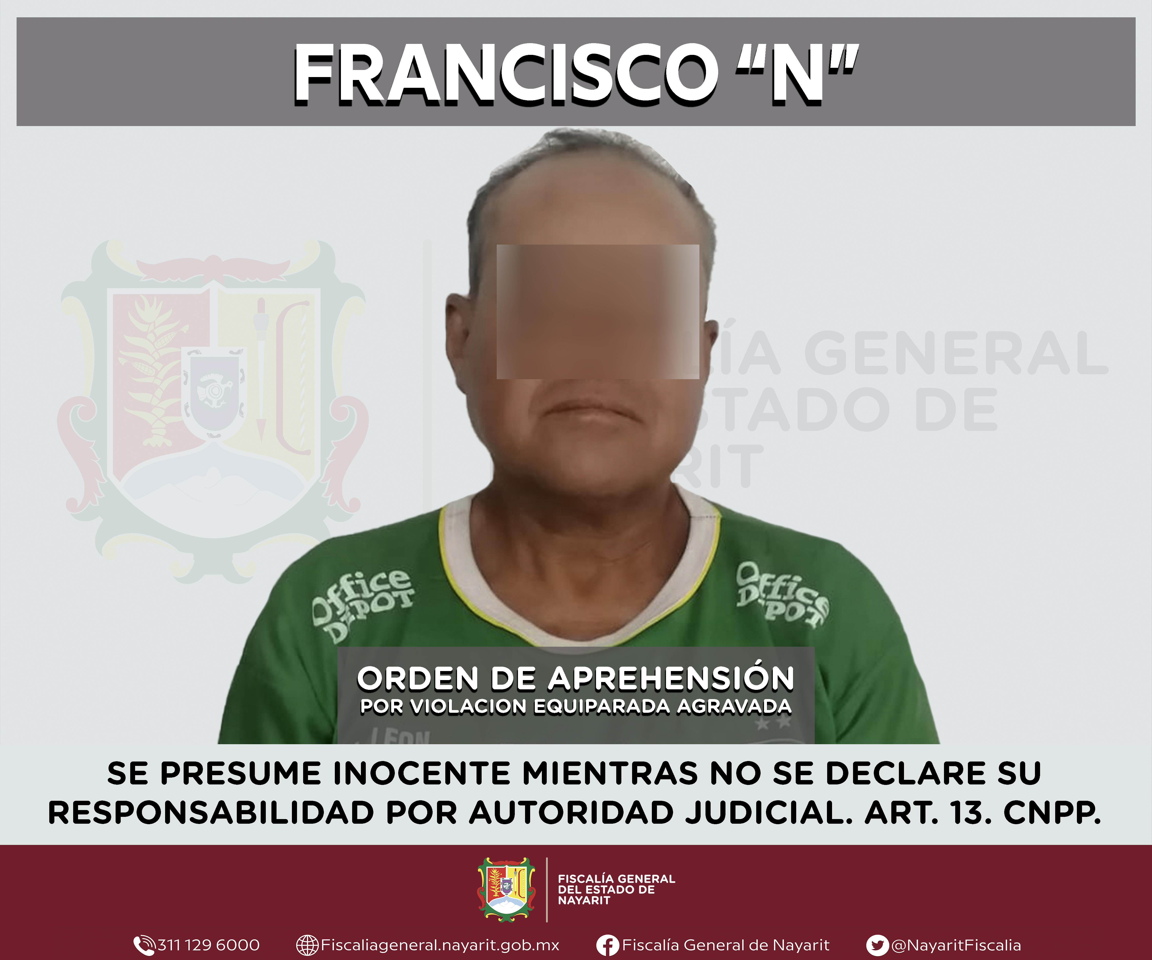 La Fiscalía General del estado de Nayarit a través de la Agencia de Investigación Criminal ejecutó una orden de aprehensión en la localidad San Vicente, municipio de Rosamorada contra Francisco “N”, por su presunta participación en hechos que s...