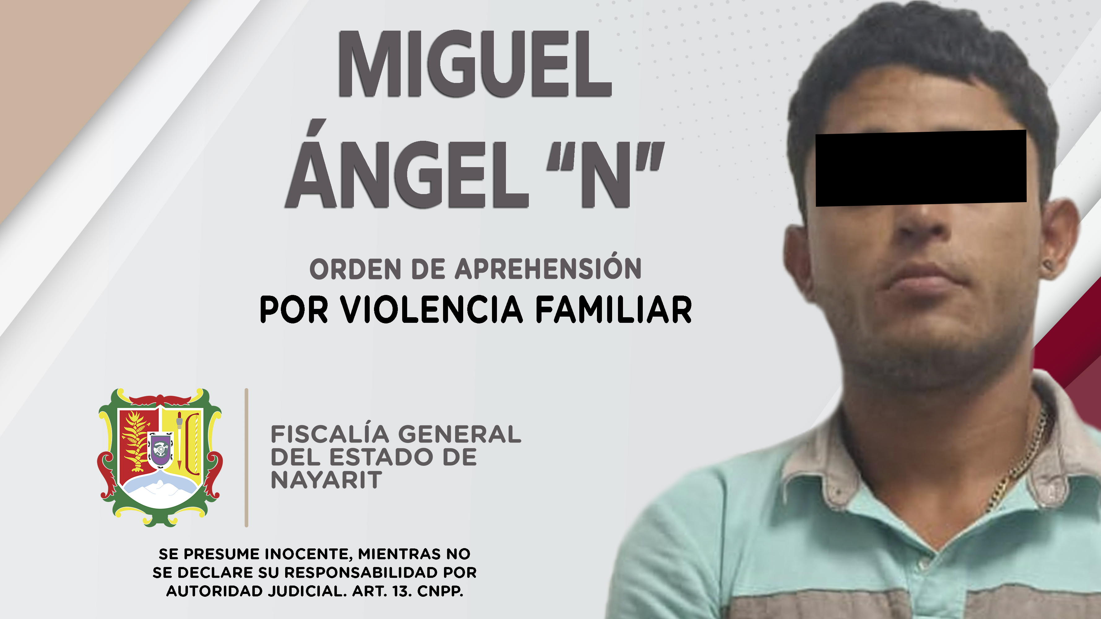 Fiscalía General de Nayarit a través de la Agencia de Investigación Criminal, ejecutó una orden de aprehensión en el poblado Jarretaderas, municipio de Bahía de Banderas contra Miguel Ángel “N”, por su presunta participación en hechos que seg...