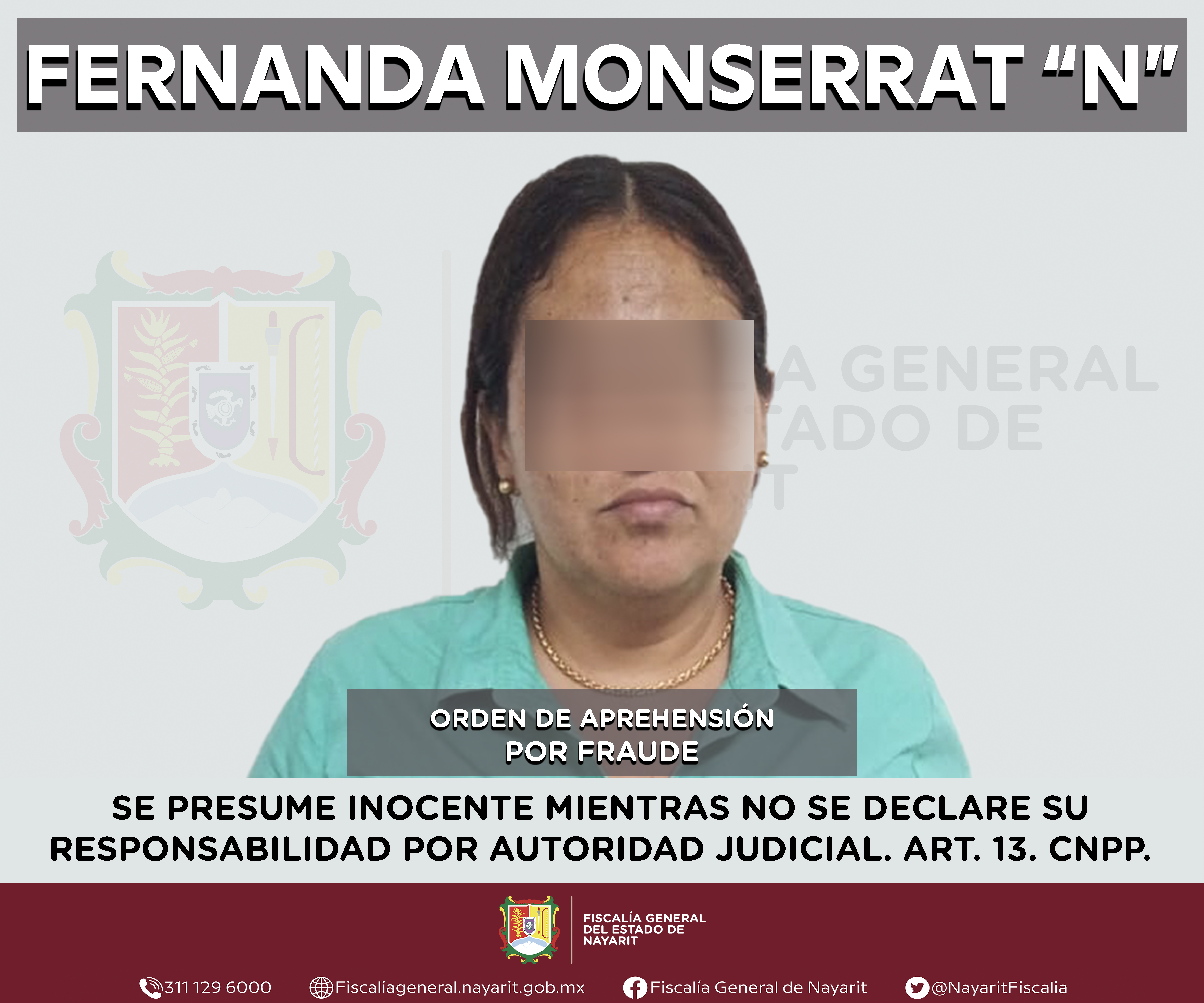 La Fiscalía General de Nayarit a través de la Agencia de Investigación Criminal dio cumplimiento a una orden de aprehensión en el municipio de San Blas contra Fernanda Monserrat “N”, por su probable responsabilidad penal en hechos que bajo la apr...