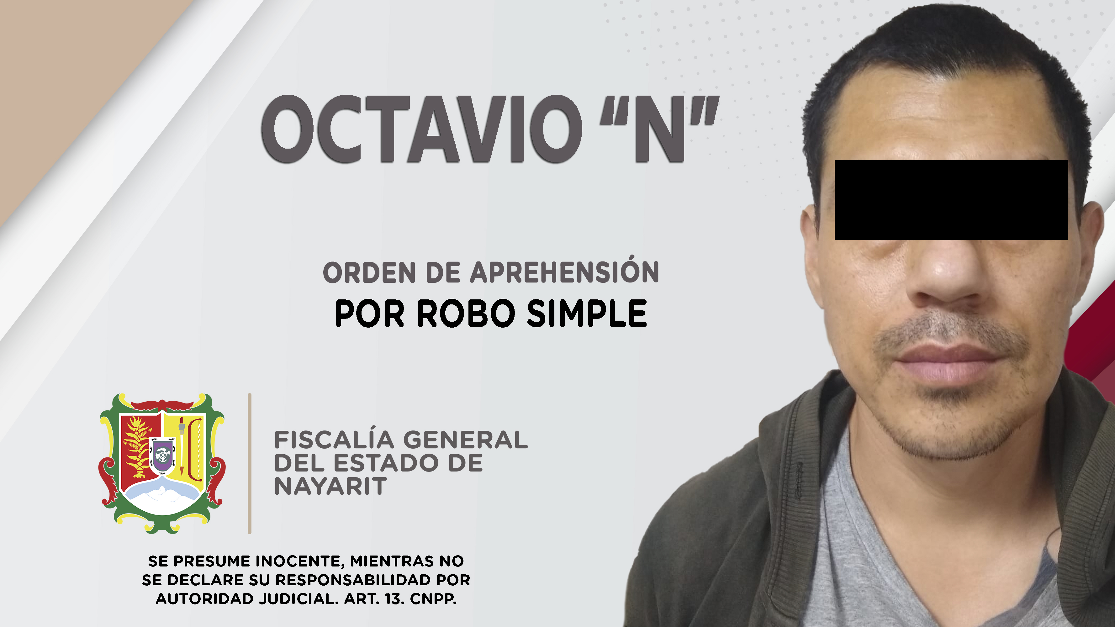 Fiscalía General de Nayarit a través de la Agencia de Investigación Criminal, ejecutó una orden de aprehensión en el poblado San Cayetano, municipio de Tepic contra Octavio “N”, porque se presume su participación en hechos que según apreciaci...