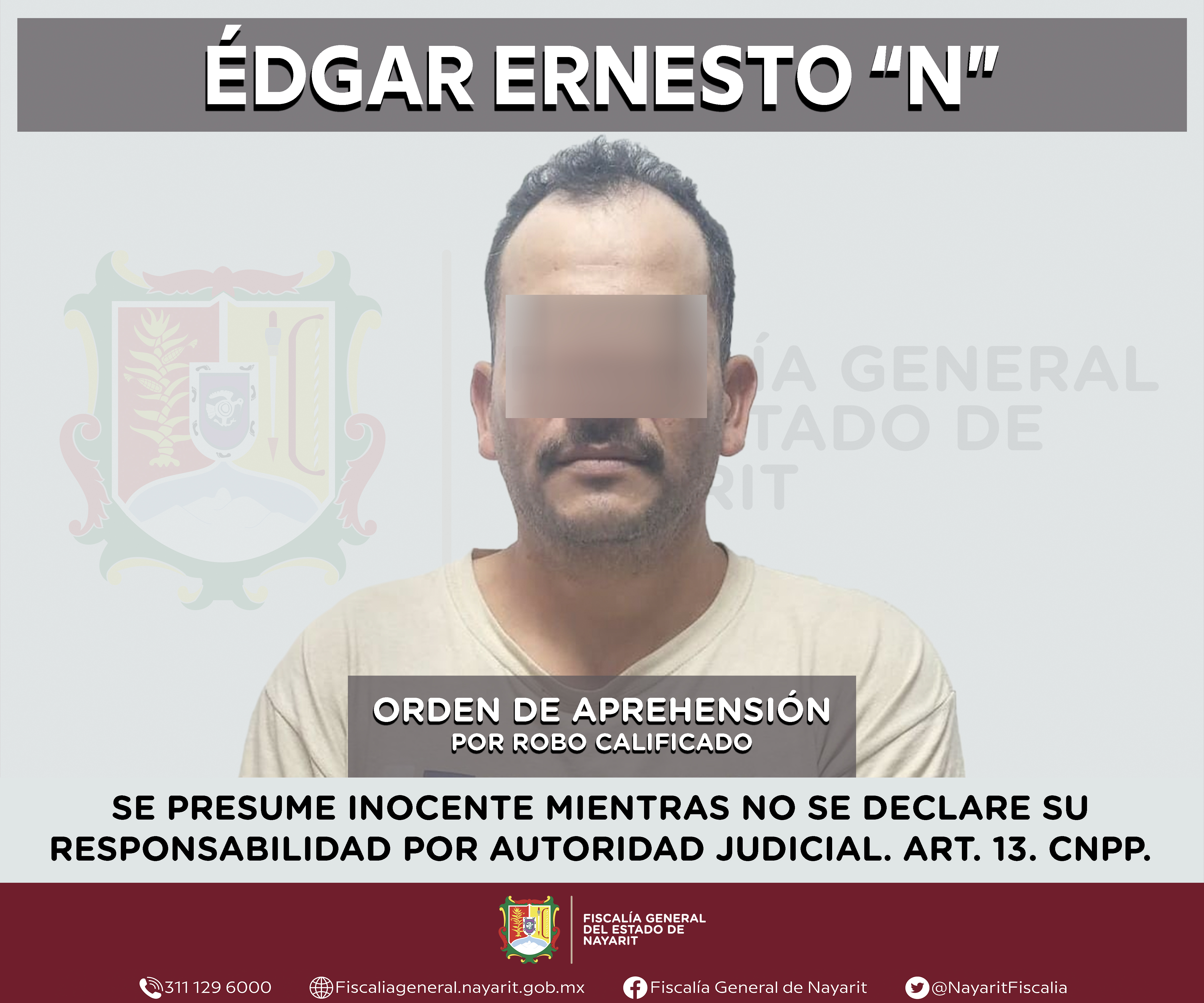 Elementos de la Agencia de Investigación Criminal de Nayarit ejecutaron una orden de aprehensión en la ciudad de Tepic contra Édgar Ernesto “N”, por su presunta participación en hechos que según apreciación de la ley encuadran el delito de robo...