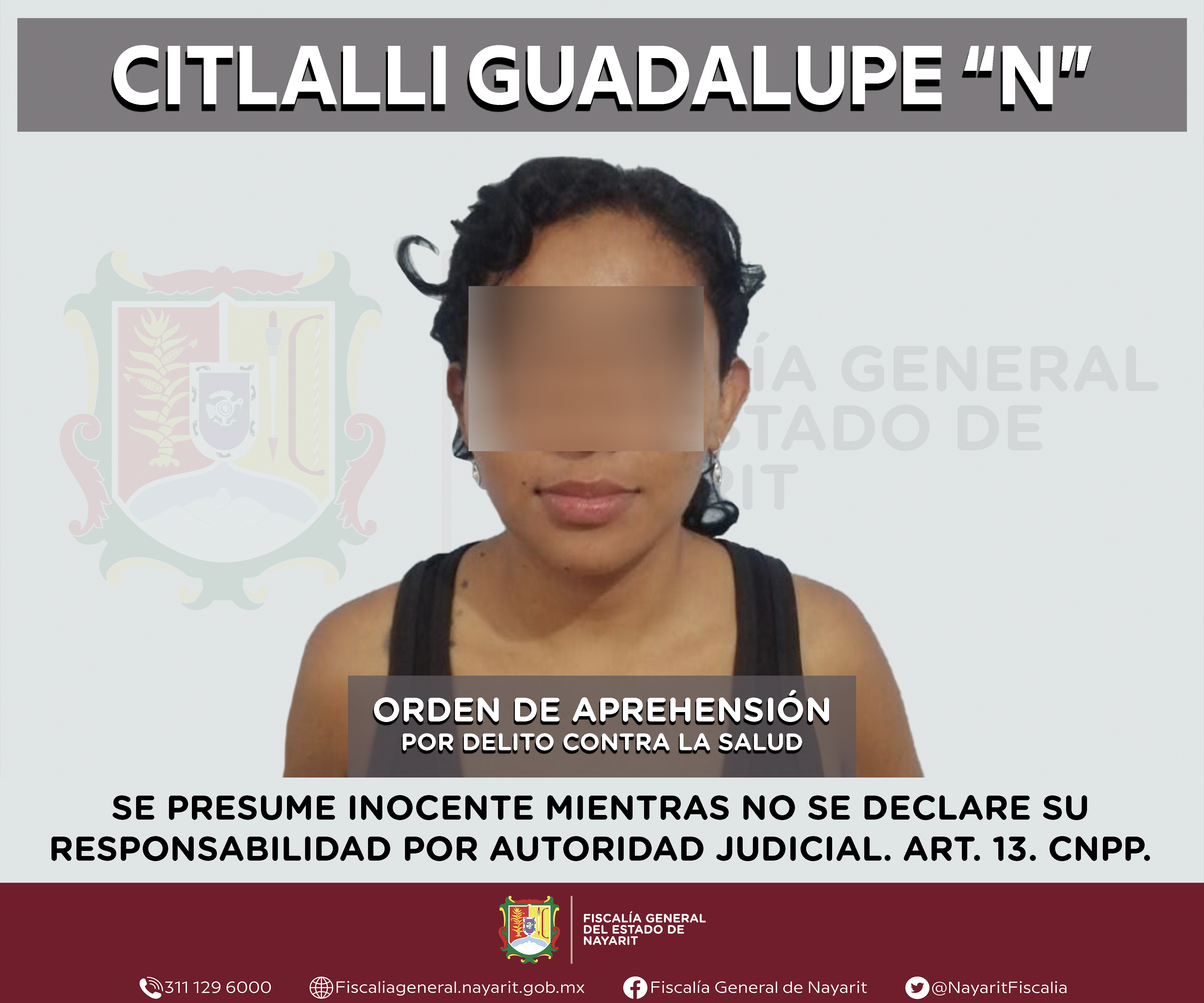 Elementos de la Agencia de Investigación Criminal de Nayarit ejecutaron una orden de aprehensión en el municipio de Xalisco contra Citlalli Guadalupe “N”, por su presunta participación en hechos que según apreciación de la ley encuadran el delit...