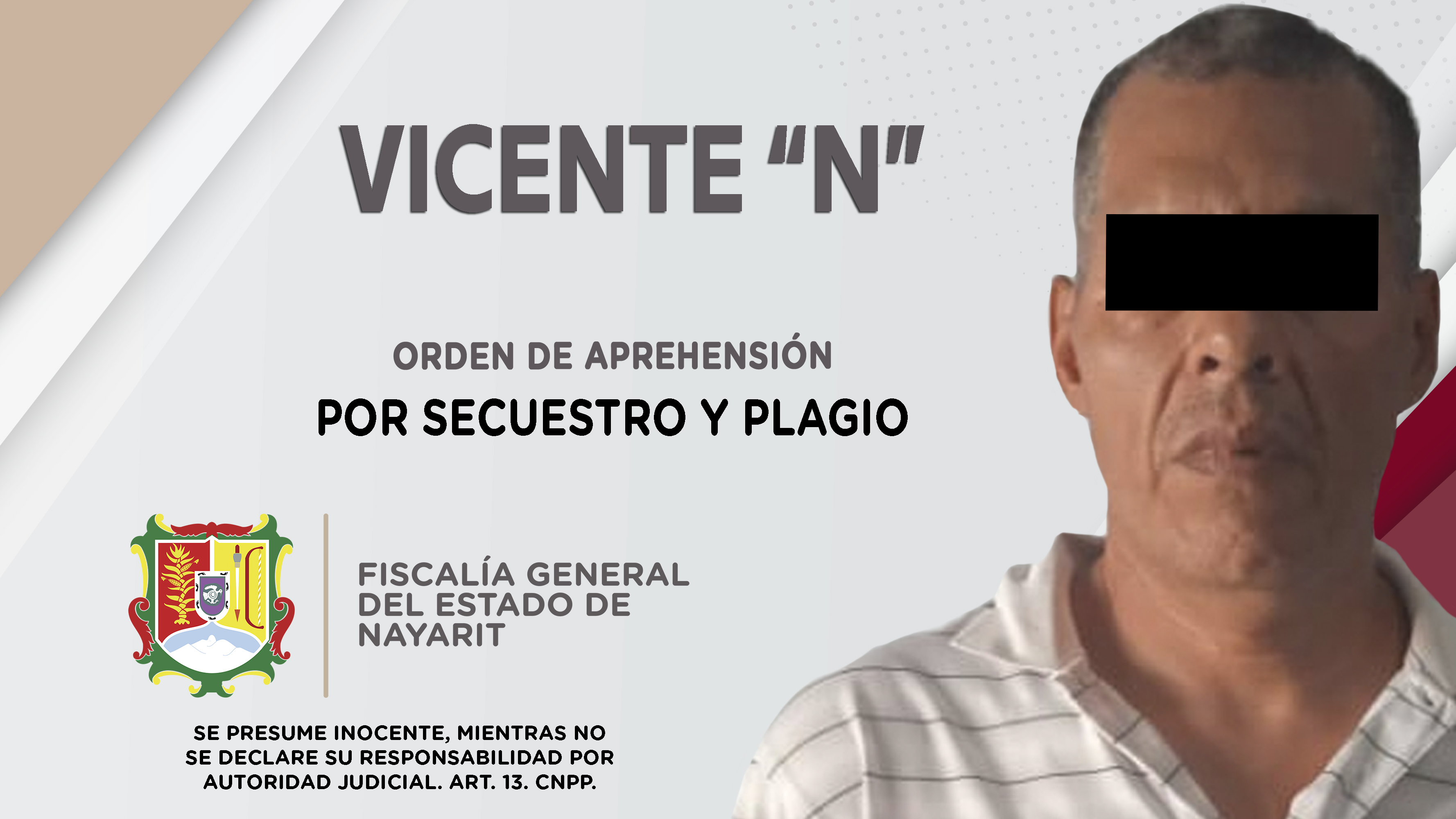 Personal de la Agencia de Investigación Criminal de Nayarit dio cumplimiento a una orden de aprehensión en esta ciudad contra Vicente “N”, por su presuntiva responsabilidad penal en hechos que la ley considera como delitos de secuestro y plagio, co...
