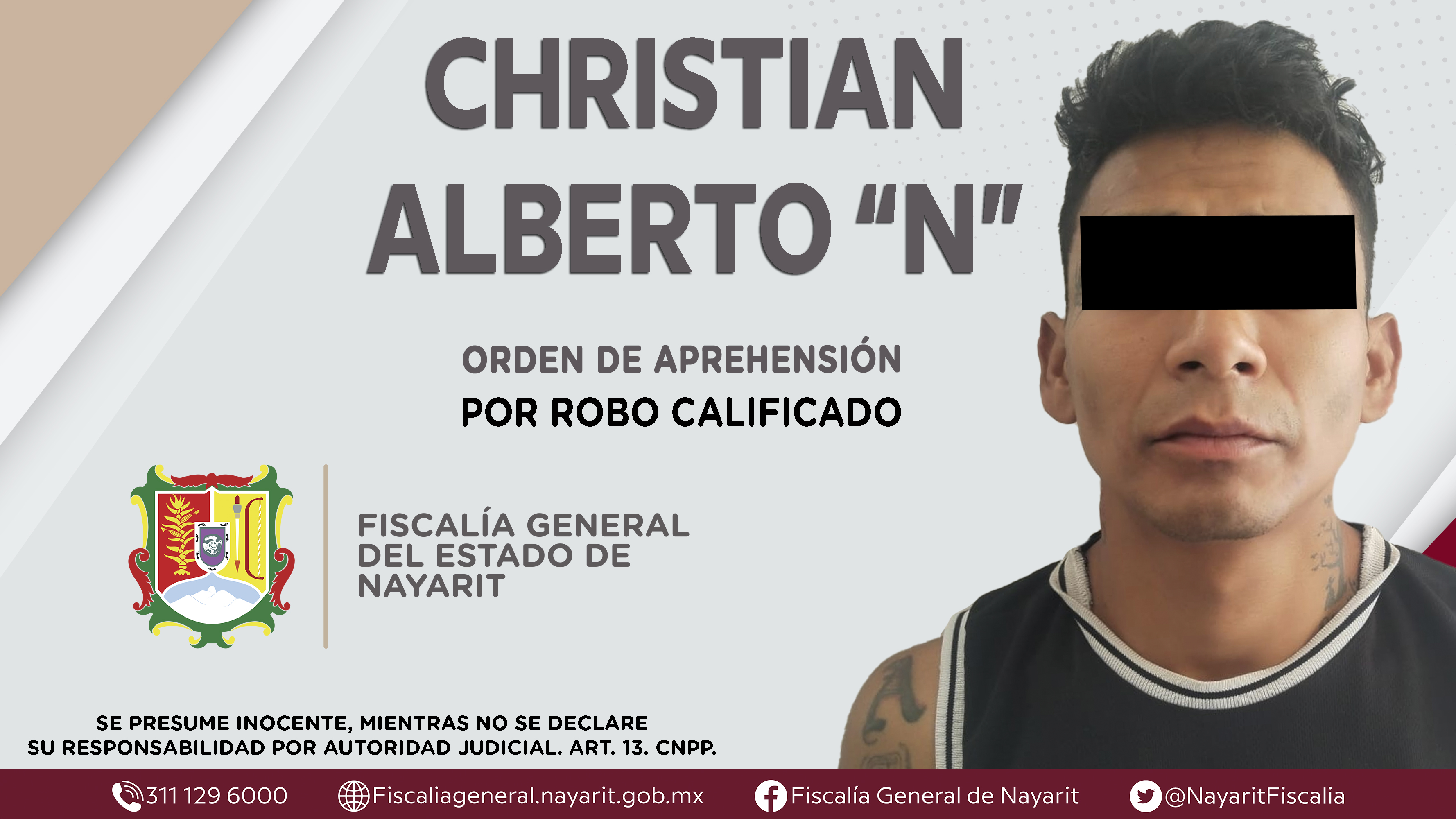 Elementos de la Agencia de Investigación Criminal de Nayarit ejecutaron una orden de aprehensión en la ciudad de Tepic contra Christian Alberto “N”, por su presunta participación en hechos que según apreciación de la ley encuadran el delito de r...