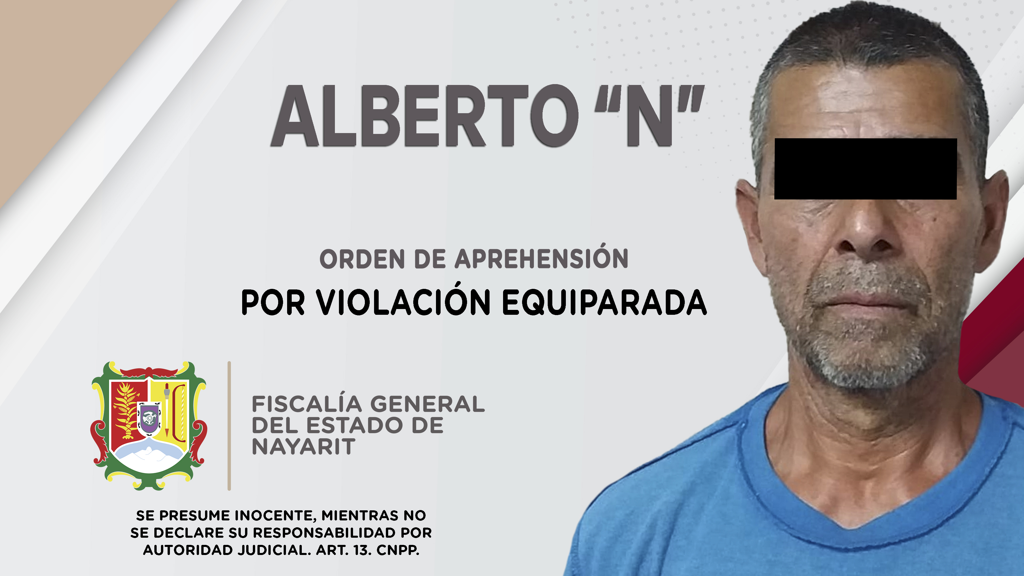 Personal de la Agencia de Investigación Criminal de Nayarit dio cumplimiento a una orden de aprehensión en esta ciudad contra Alberto “N”, por su presuntiva responsabilidad penal en hechos que la ley considera como delito de violación equiparada, ...