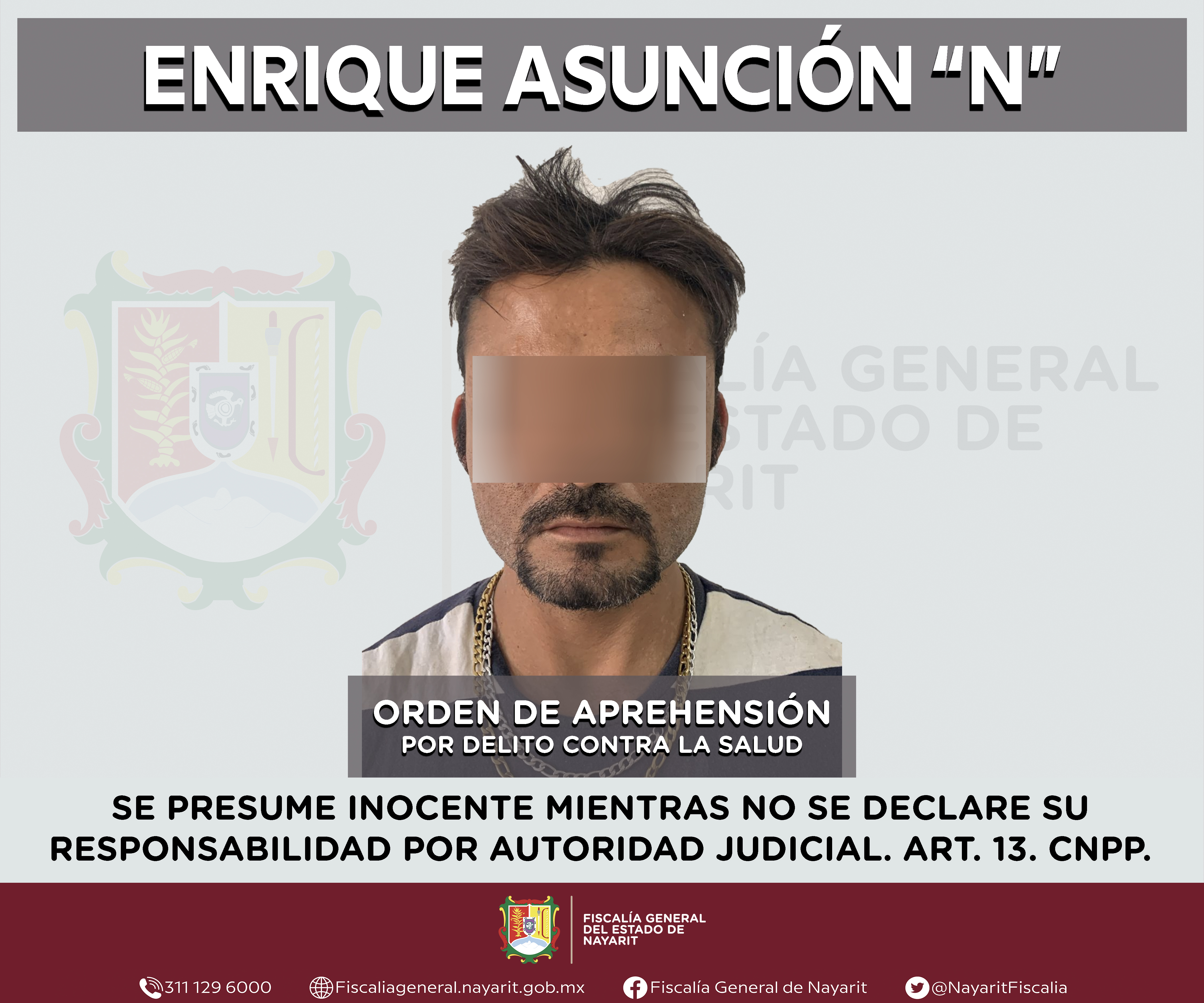 La Fiscalía General del estado de Nayarit a través de la Agencia de Investigación Criminal ejecutó una orden de aprehensión en la capital nayarita contra Enrique Asunción “N”, por su presunta participación en hechos que según valoración de l...