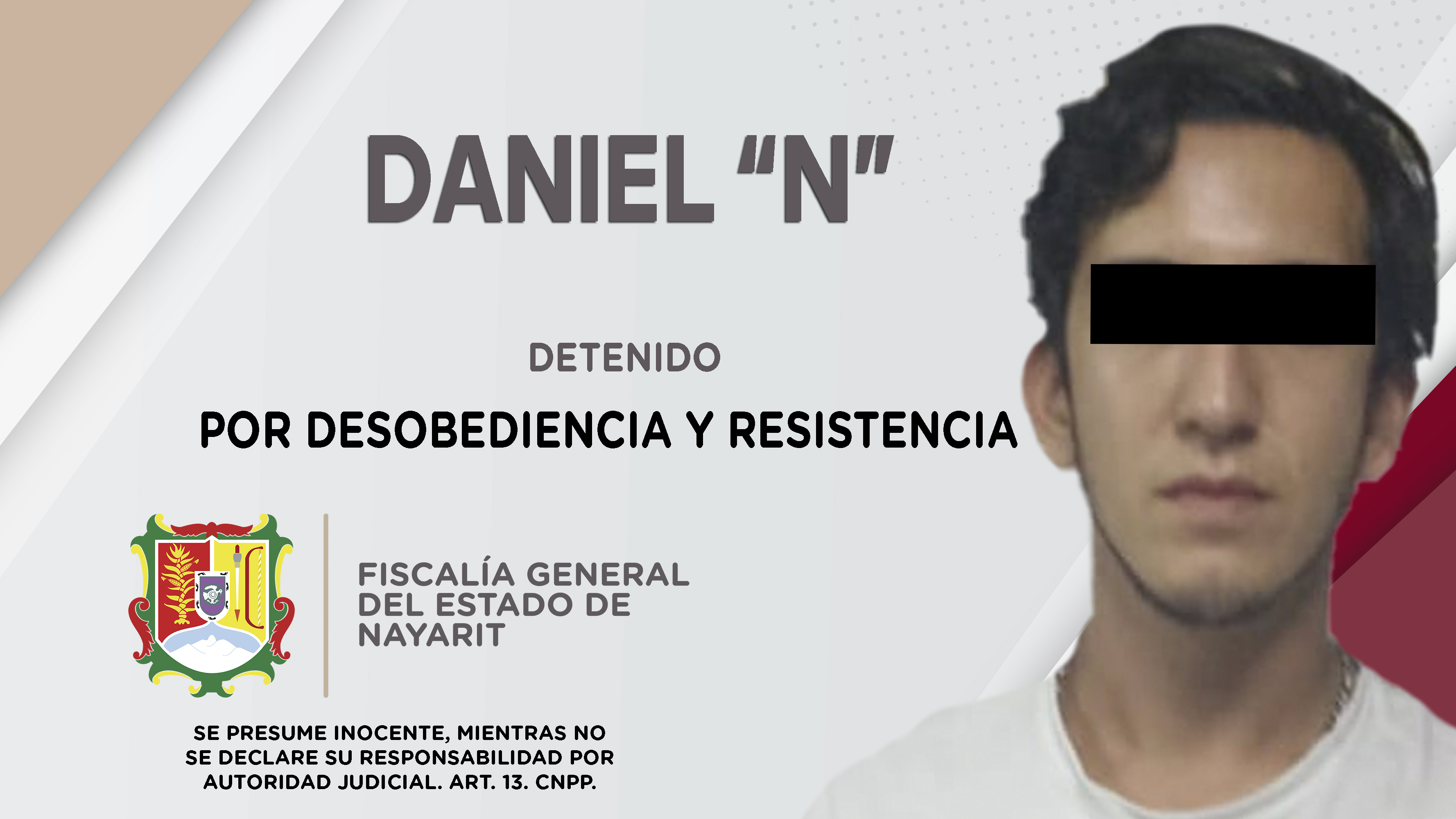 Fiscalía General de Nayarit, a través de la Agencia de Investigación Criminal, detuvo a Daniel “N” en la ciudad de Tepic, por su presunta participación en hechos que para ley configuran el delito de desobediencia y resistencia, cometido en agravi...