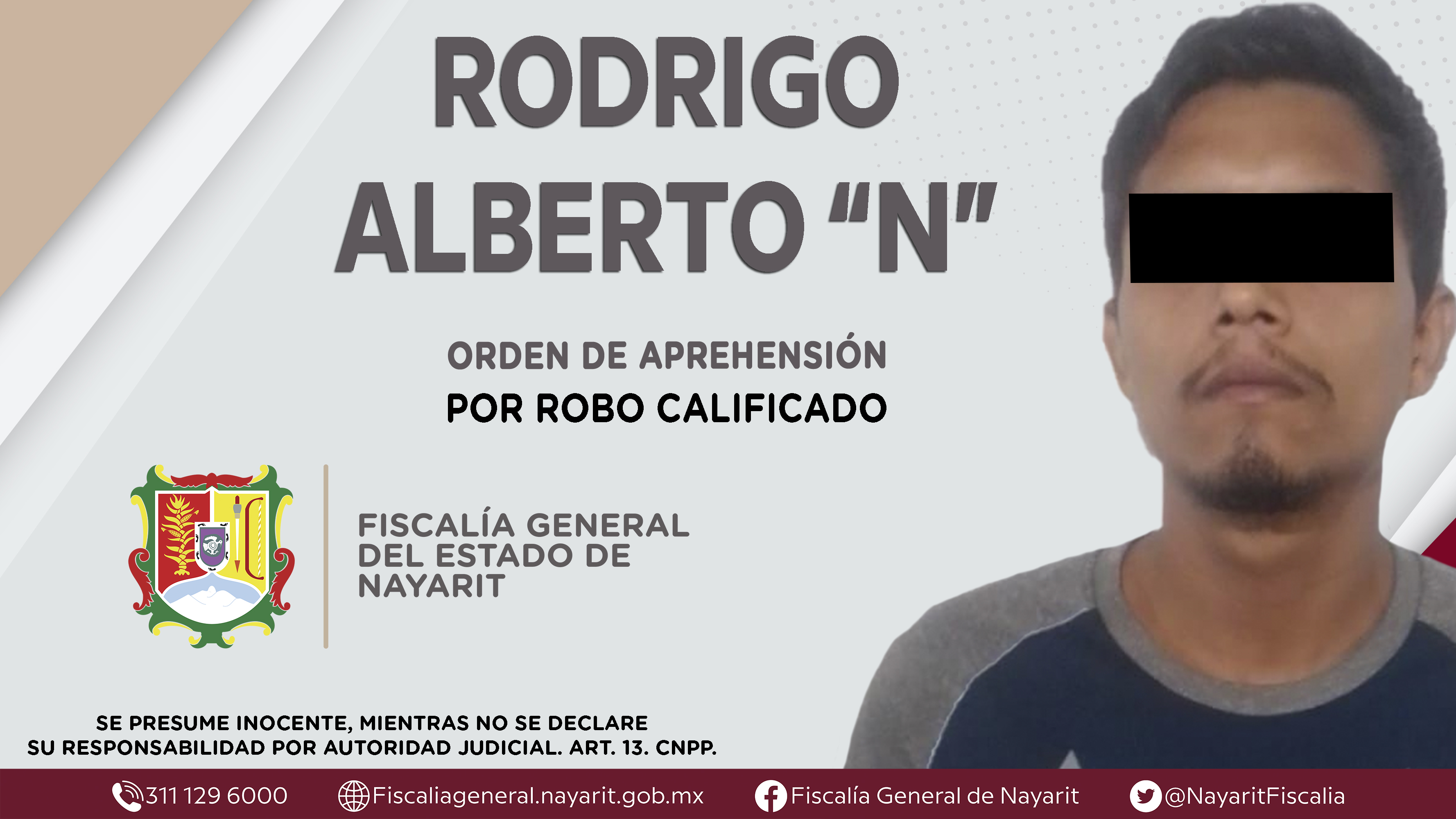 Elementos de la Agencia de Investigación Criminal de Nayarit ejecutaron una orden de aprehensión en la capital nayarita contra Rodrigo Alberto “N”, por su presunta participación en hechos que según apreciación de la ley configuran el delito de r...