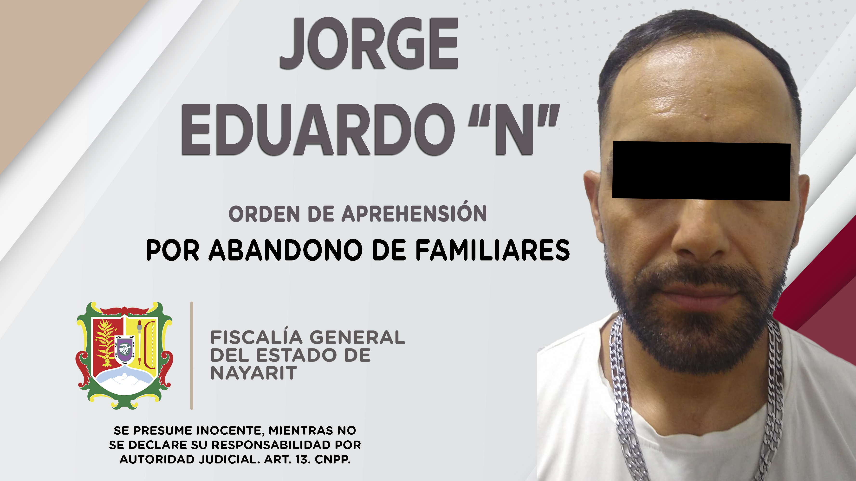 Personal de la Agencia de Investigación Criminal de Nayarit dio cumplimiento a una orden de aprehensión en la ciudad de Tepic contra Jorge Eduardo “N”, por su presuntiva responsabilidad penal en hechos que la ley juzga como delito de abandono de fa...