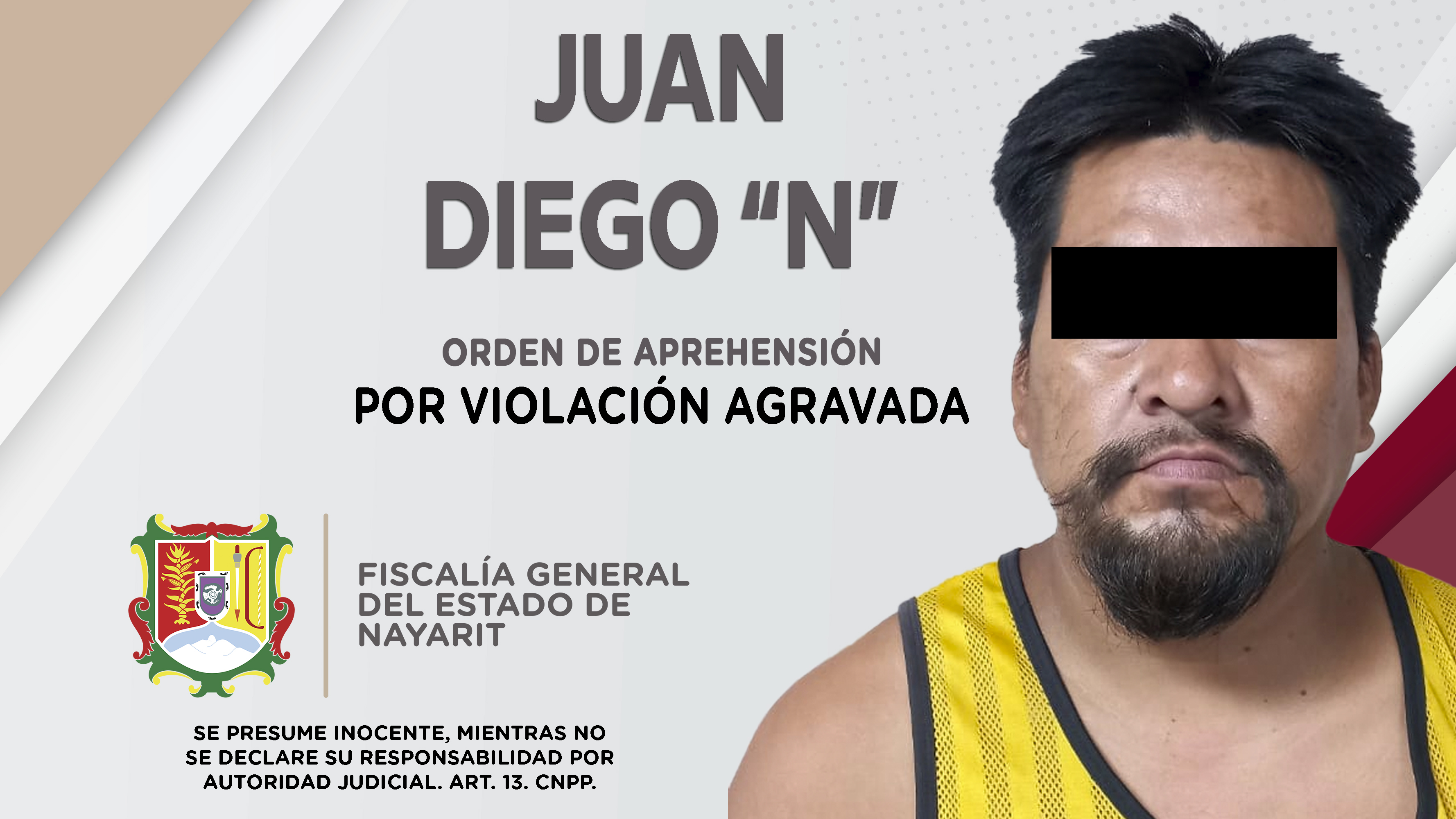 Elementos de la Agencia de Investigación Criminal de Nayarit dieron cumplimiento a una orden de aprehensión que se obsequió en la ciudad de Tepic contra Juan Diego “N”, por su probable participación en hechos que la ley califica como delito de vi...