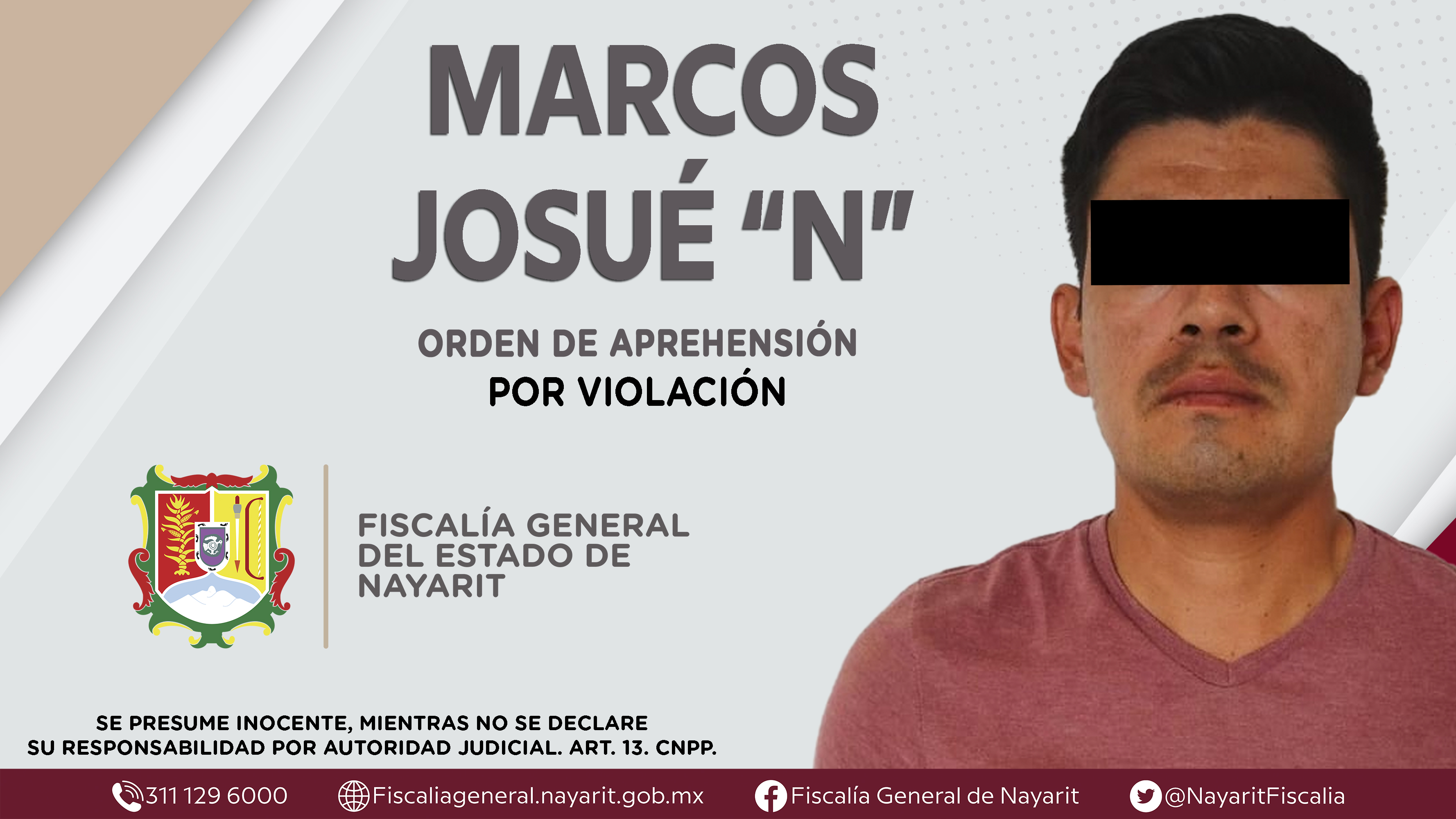 La Fiscalía General del Estado a través de la Agencia de Investigación Criminal dio cumplimiento a una orden de aprehensión en el poblado Mesillas, municipio de Compostela contra Marcos Josué “N”, por su presunta participación en hechos que seg...
