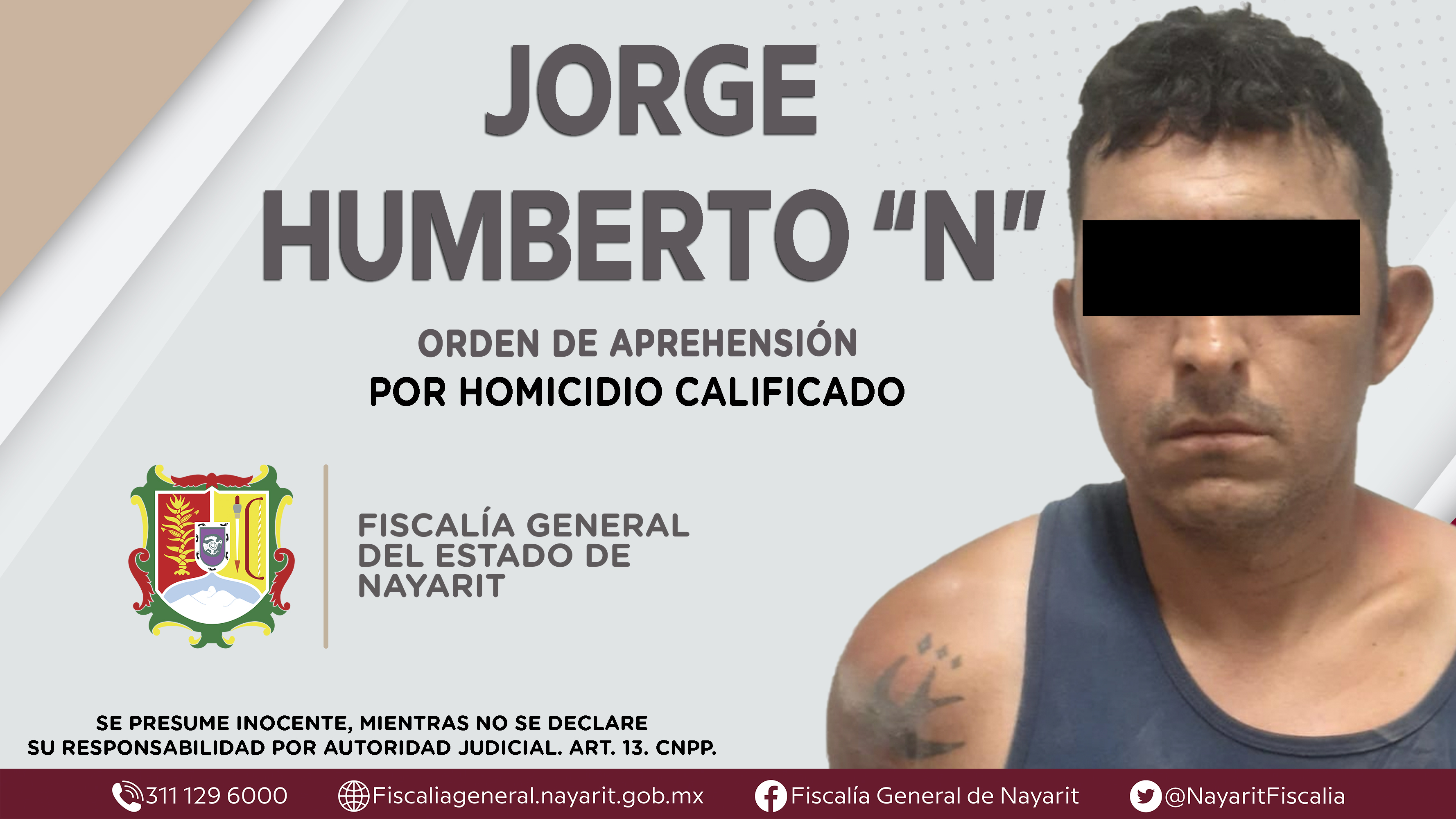 La Fiscalía General del Estado a través de la Agencia de Investigación Criminal dio cumplimiento a una orden de aprehensión en el municipio de Bahía de Banderas contra Jorge Humberto “N”, por su presunta participación en hechos que según aprec...