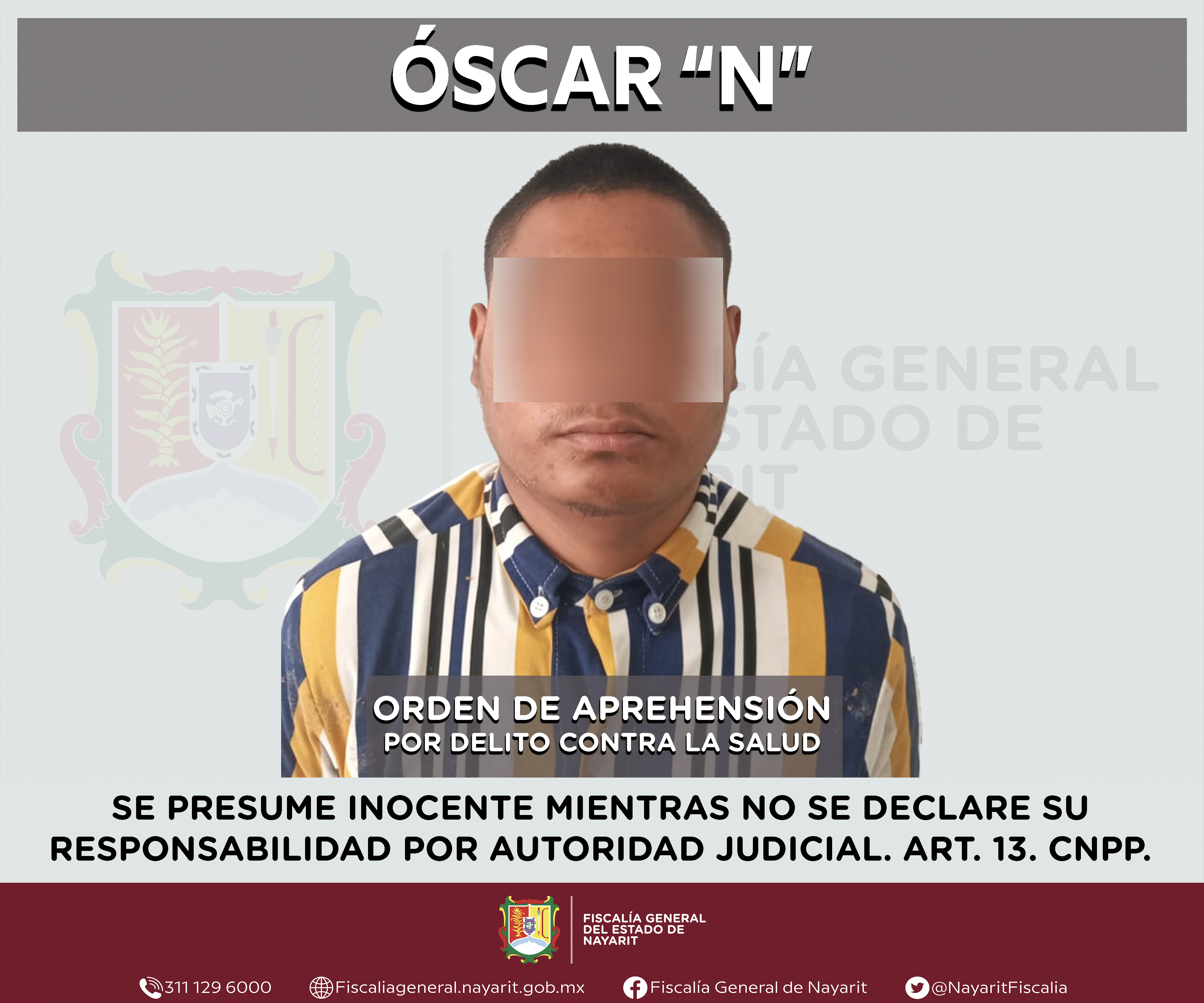 Elementos de la Agencia de Investigación Criminal de Nayarit ejecutaron una orden de aprehensión en la capital nayarita contra Óscar “N”, por su presunta participación en hechos que según valoración de la ley configuran el delito contra la salu...