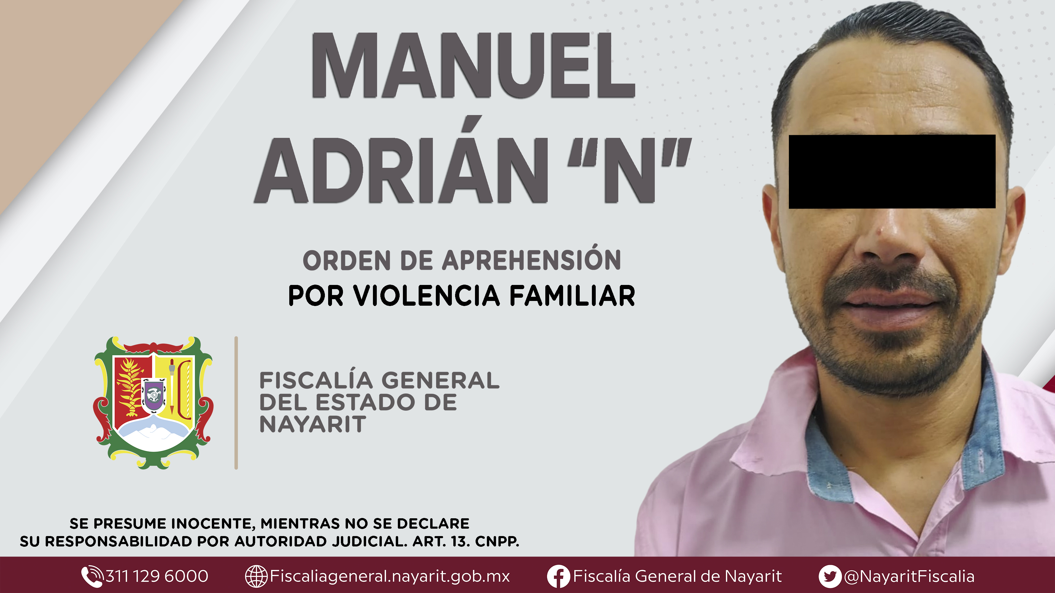 La Fiscalía General del Estado a través de la Agencia de Investigación Criminal dio cumplimiento a una orden de aprehensión en la ciudad de Tepic contra Manuel Adrián “N”, por su presunta participación en hechos que según apreciación de la le...